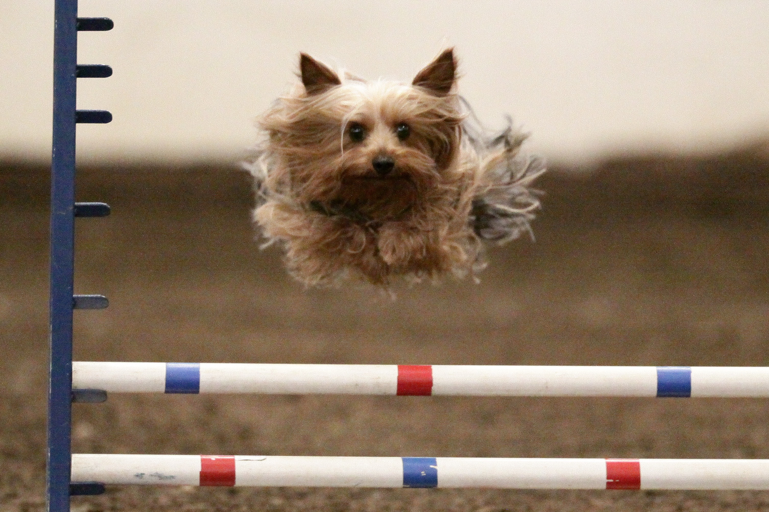 Painting of a Yorkshire Terrier with blue eyes and long fur, running and panting