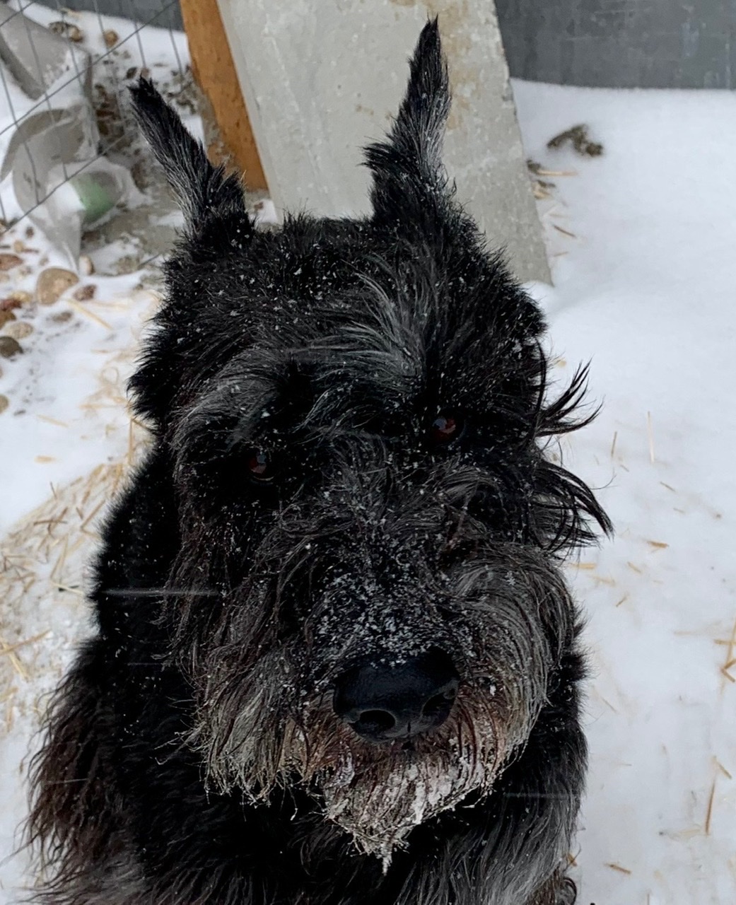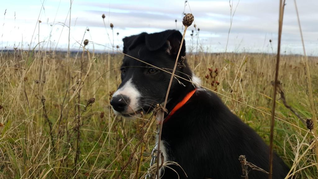 Painting of a black and white dog wearing an orange collar in tall grass.