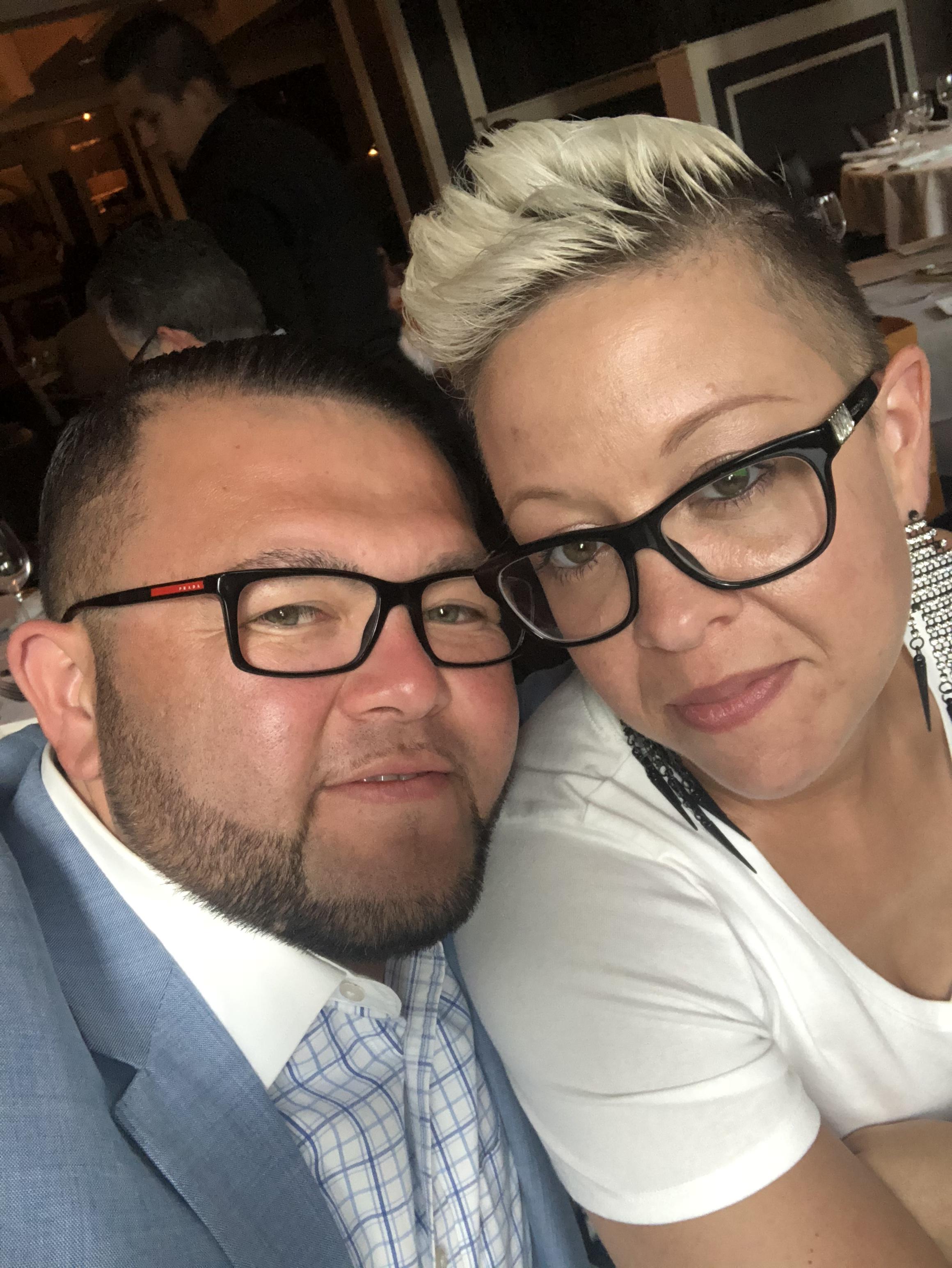 Portrait painting of a couple, a man and woman wearing glasses.