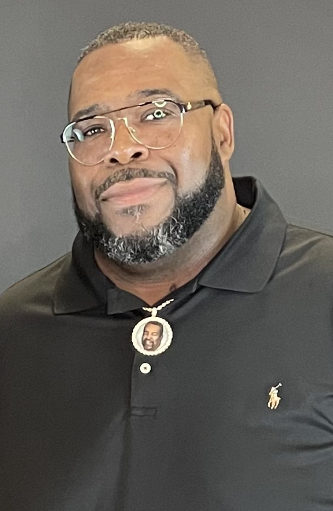Painted portrait of two men, one wearing glasses and a black shirt with a small portrait pendant.