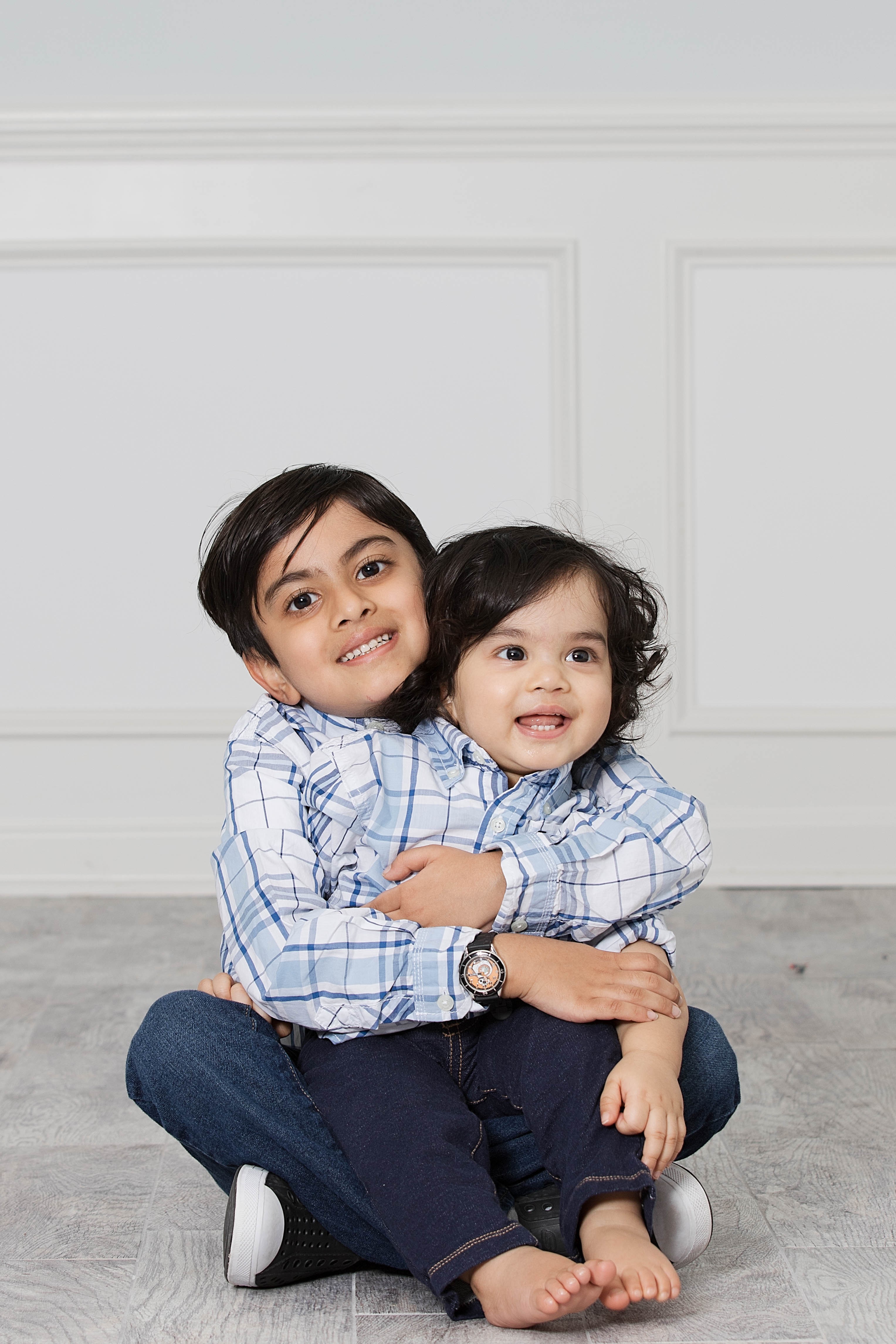 Painting of two brothers hugging, the older brother is wearing a blue plaid shirt and jeans.