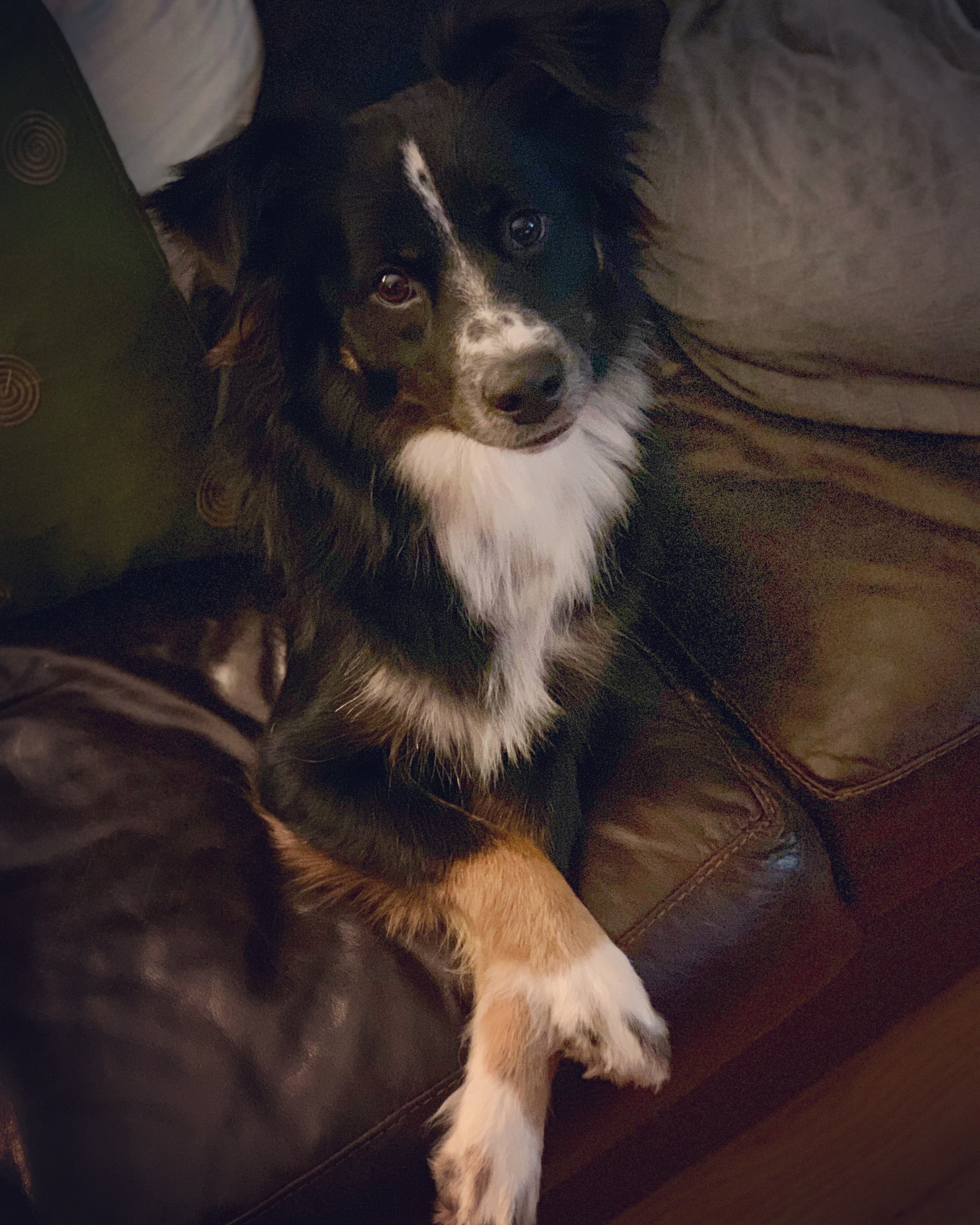 Painting of a brown and white border collie.