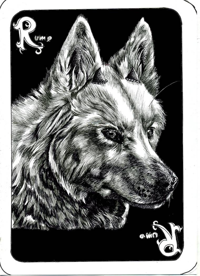 Black and white painting of a dog`s head and shoulders.