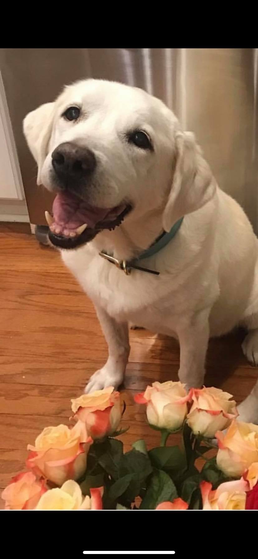 Painting of a happy white Labrador Retriever with roses.
