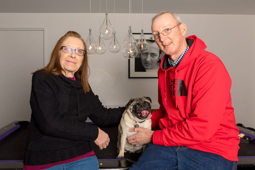 Portrait painting of a couple and their pug dog.