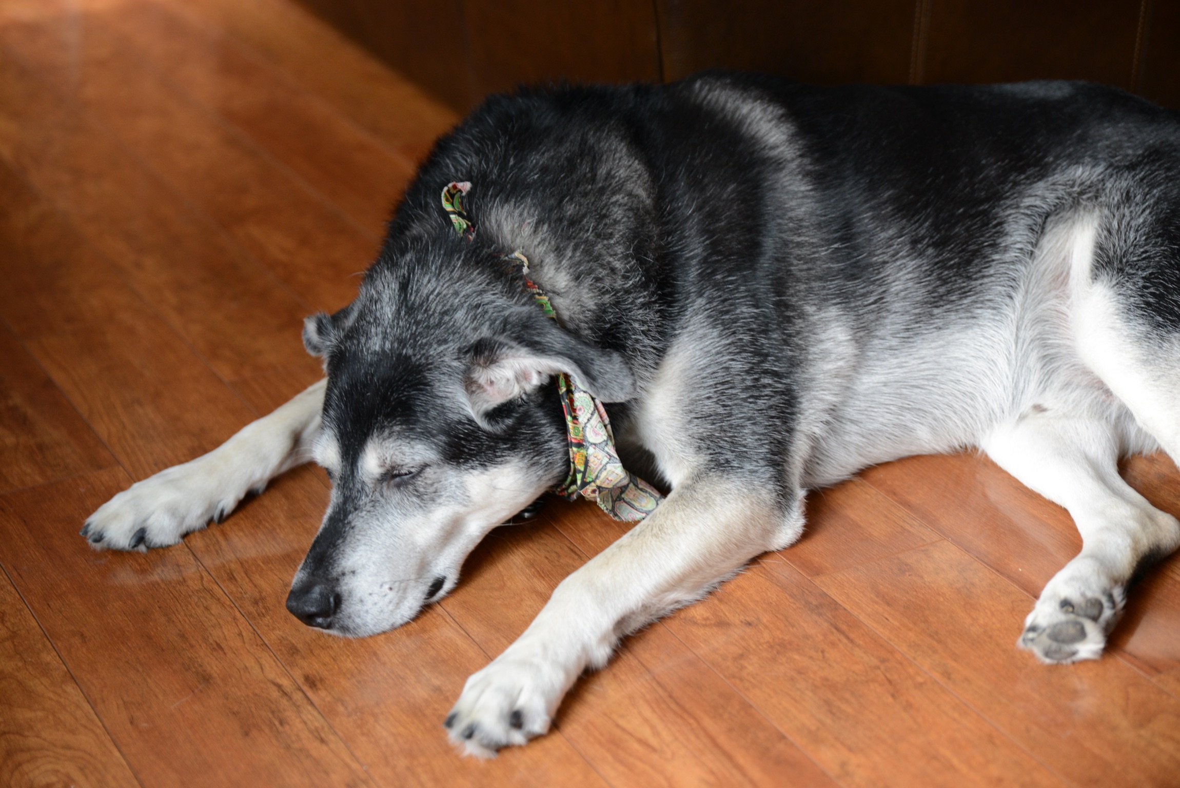 Painting of a sleeping husky-mix dog on a wood floor.