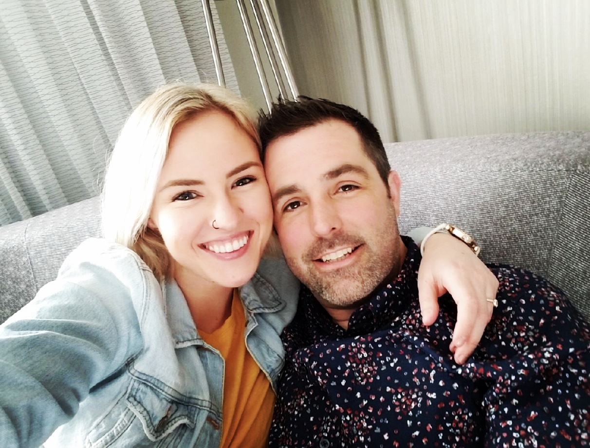 Painting of a couple, smiling and embracing.