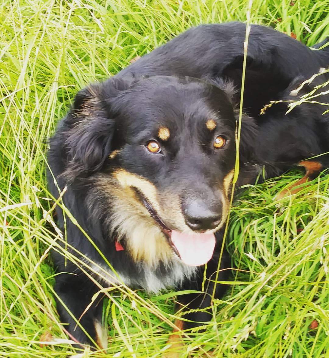 Pastel portrait of a black and tan dog lying in tall grass.