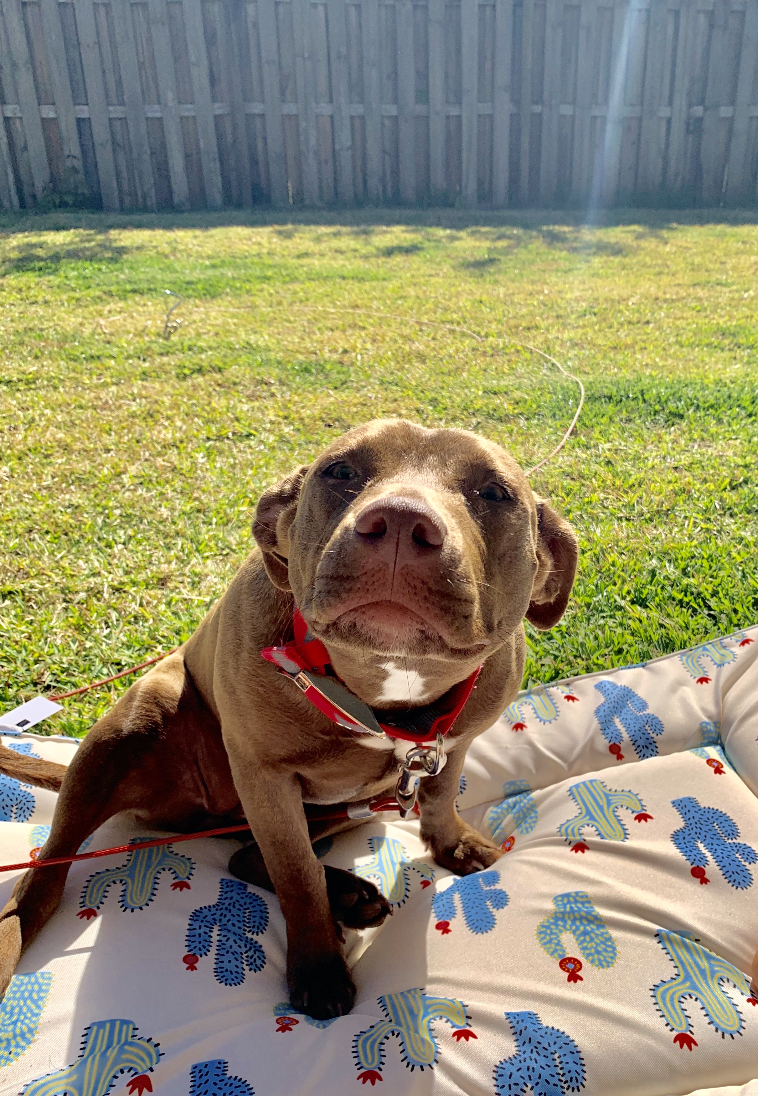 Brown dog wearing red collar sitting on cactus patterned blanket