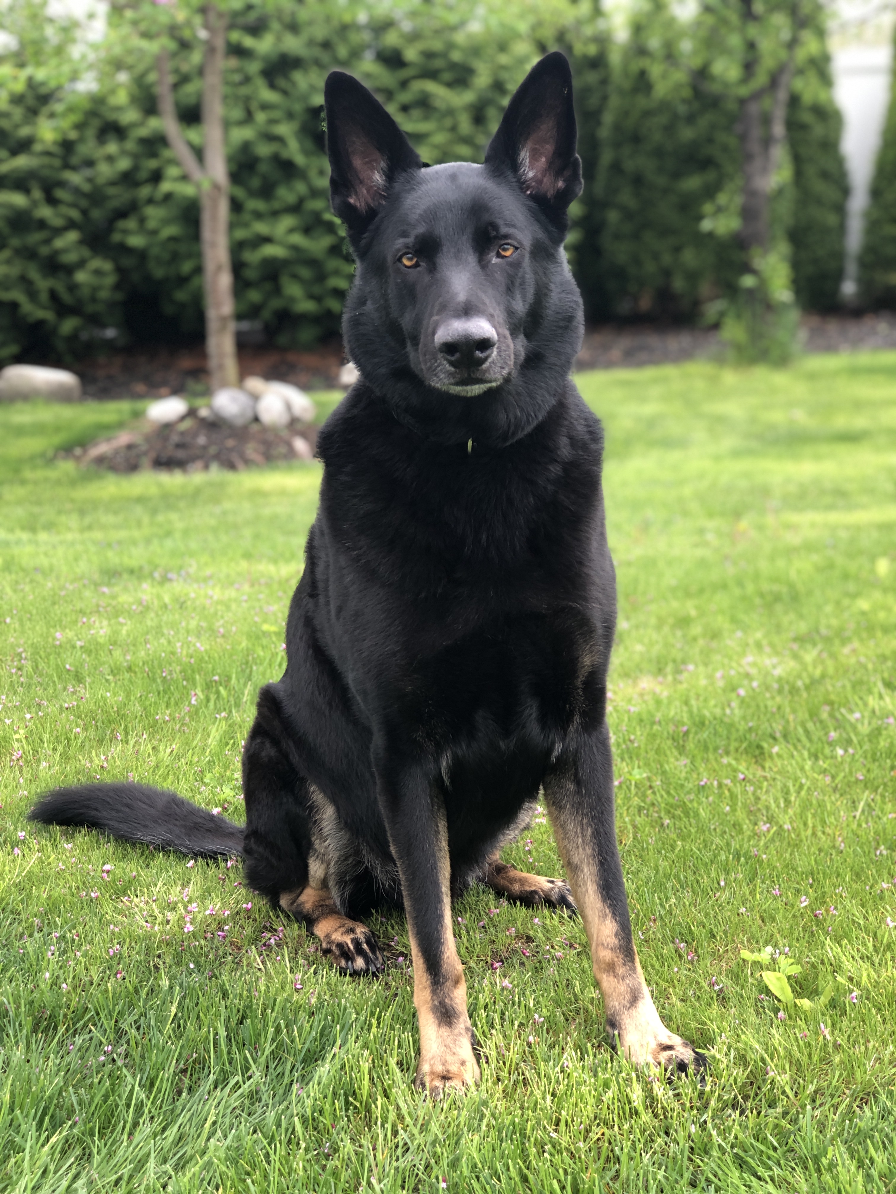 Pastel portrait of a black German Shepherd sitting in a grassy yard.