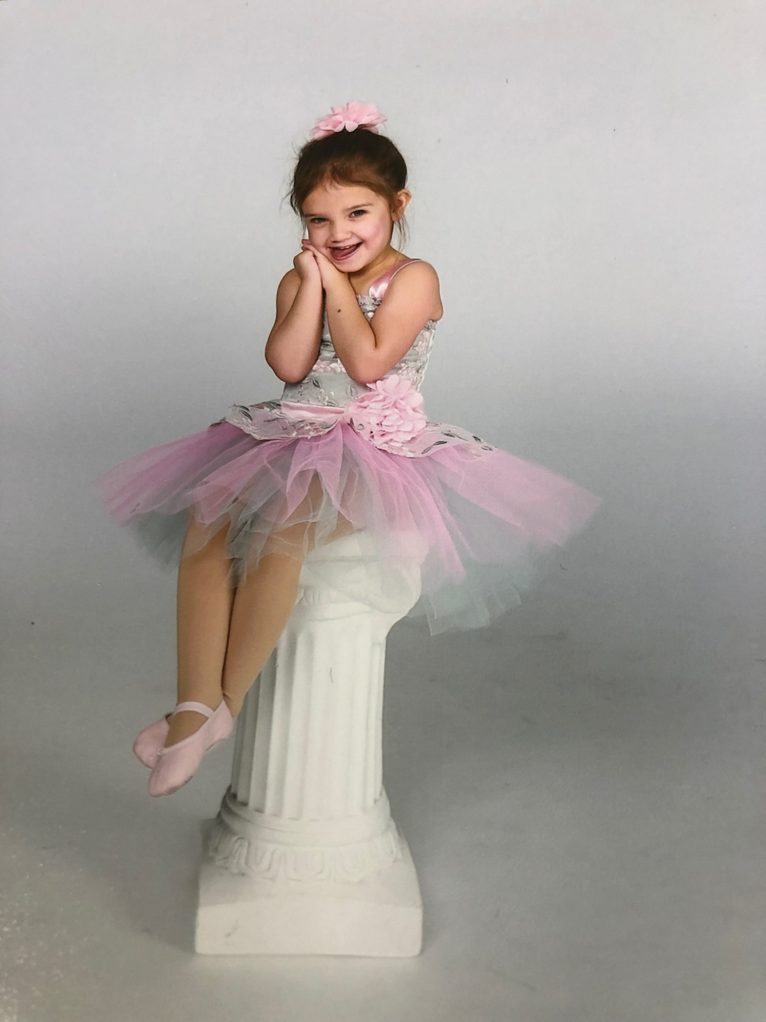 Painting of a smiling girl in a pink tutu sitting on a column.