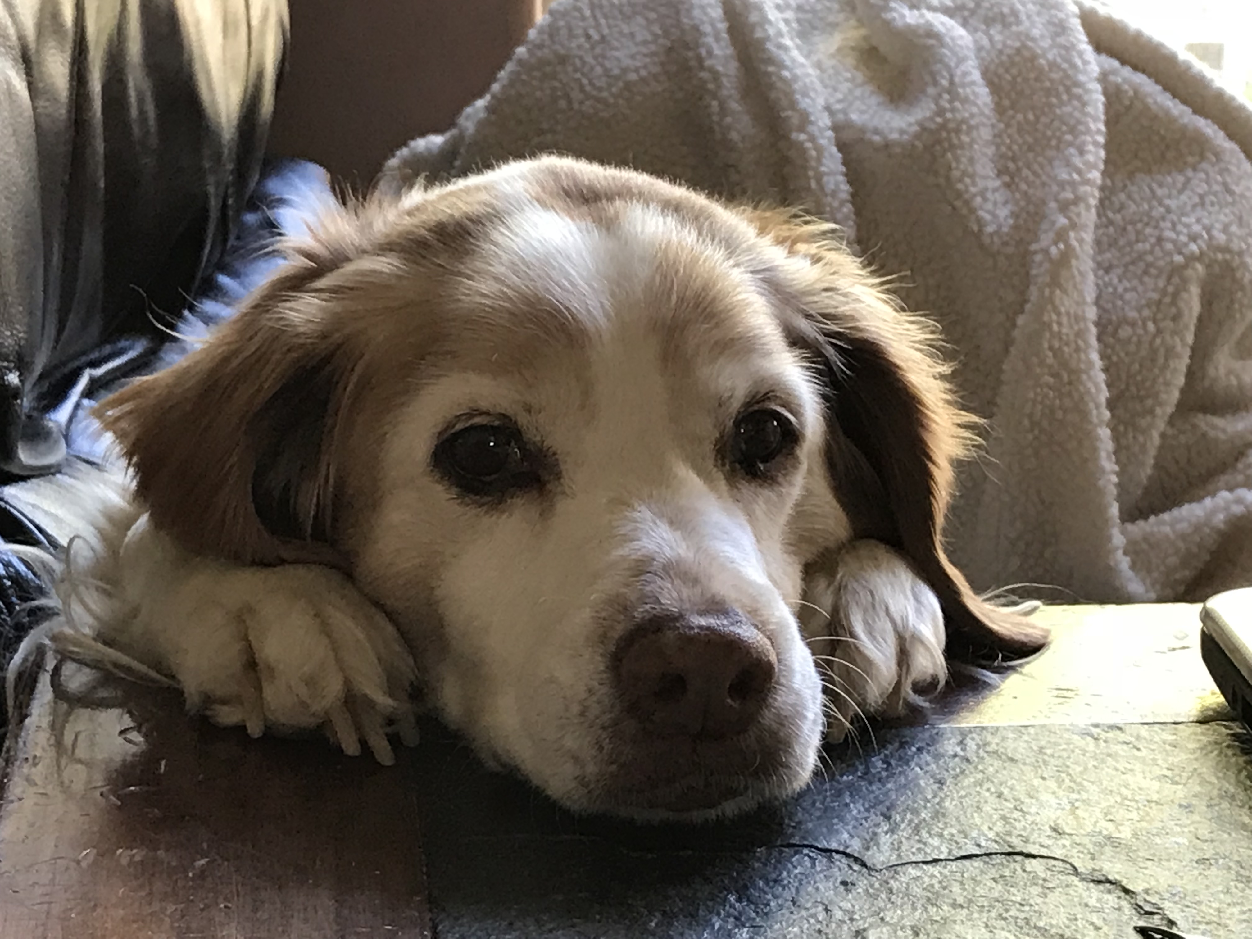Close-up pastel portrait of a light brown and white dog resting its head on its paws.