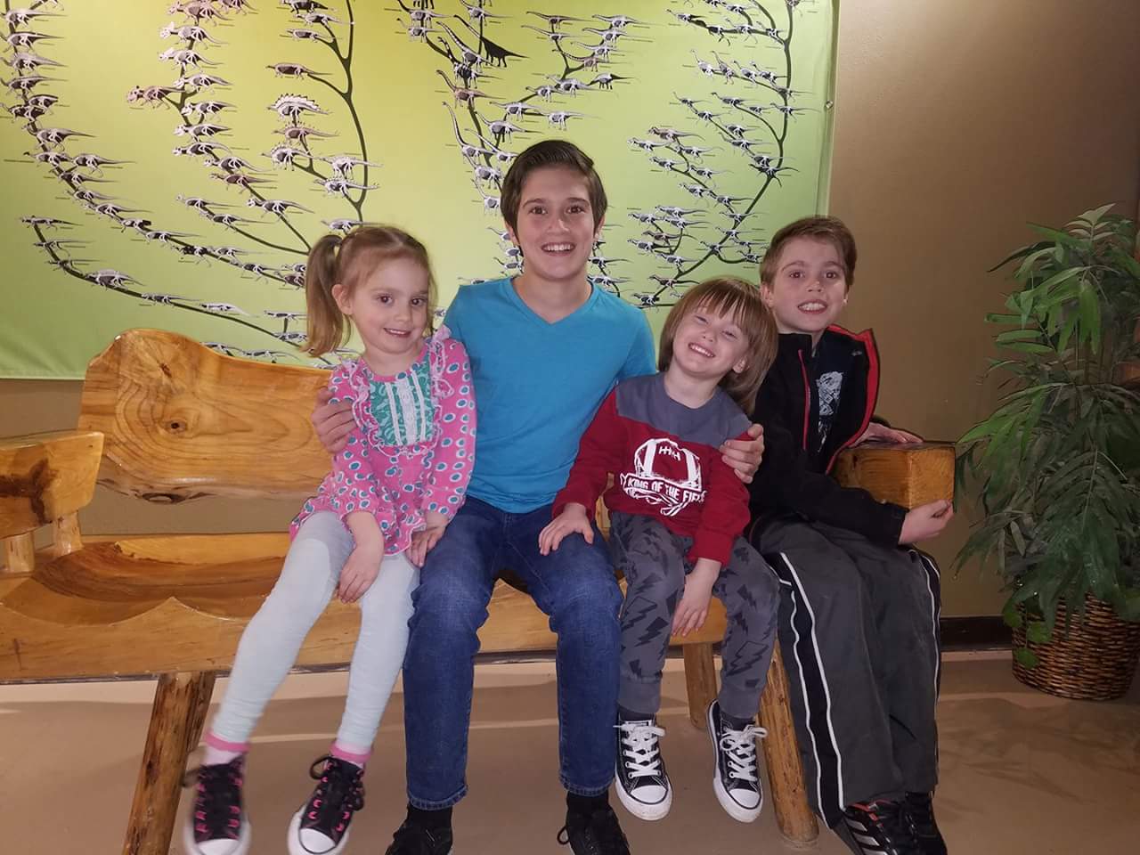 Painting of four children sitting on a park bench.