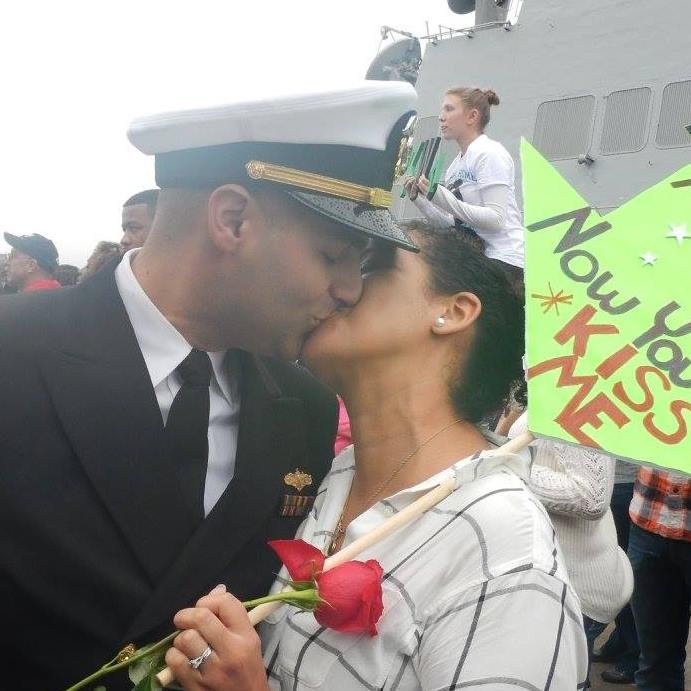 Painting of a sailor and a woman kissing, she holds a rose and a sign that says Now Kiss Me.