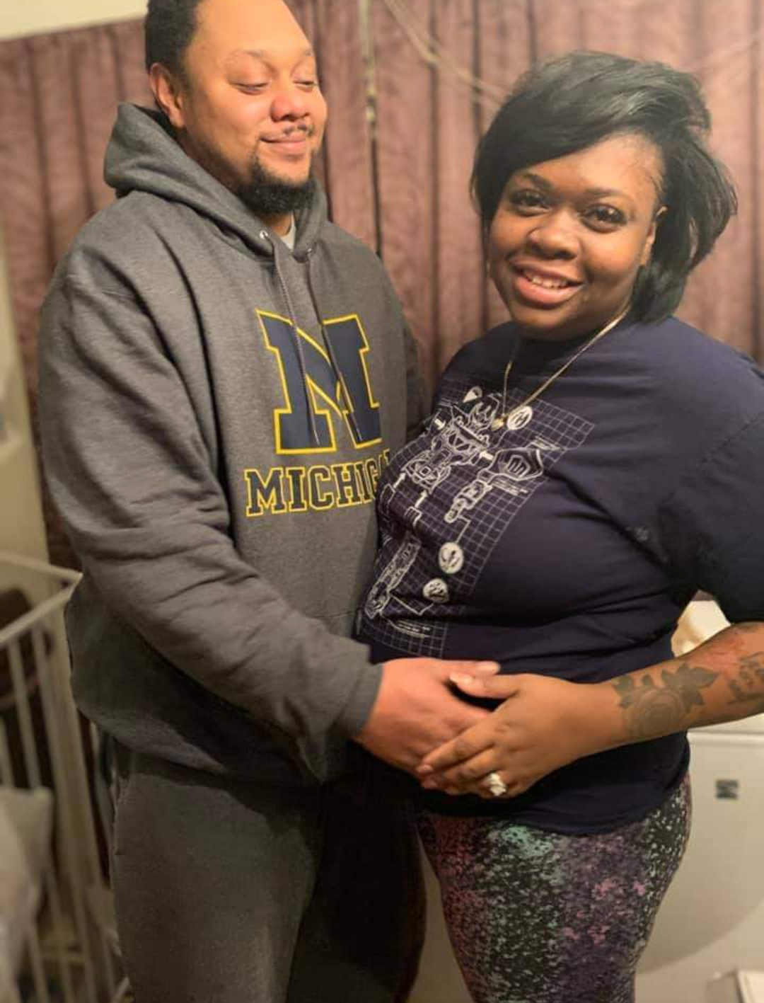 Black and white pencil drawing of a family portrait, a mother, father, and newborn baby.