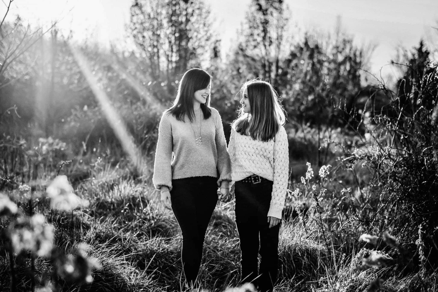 Pencil sketch of two women holding hands and smiling at each other outdoors.