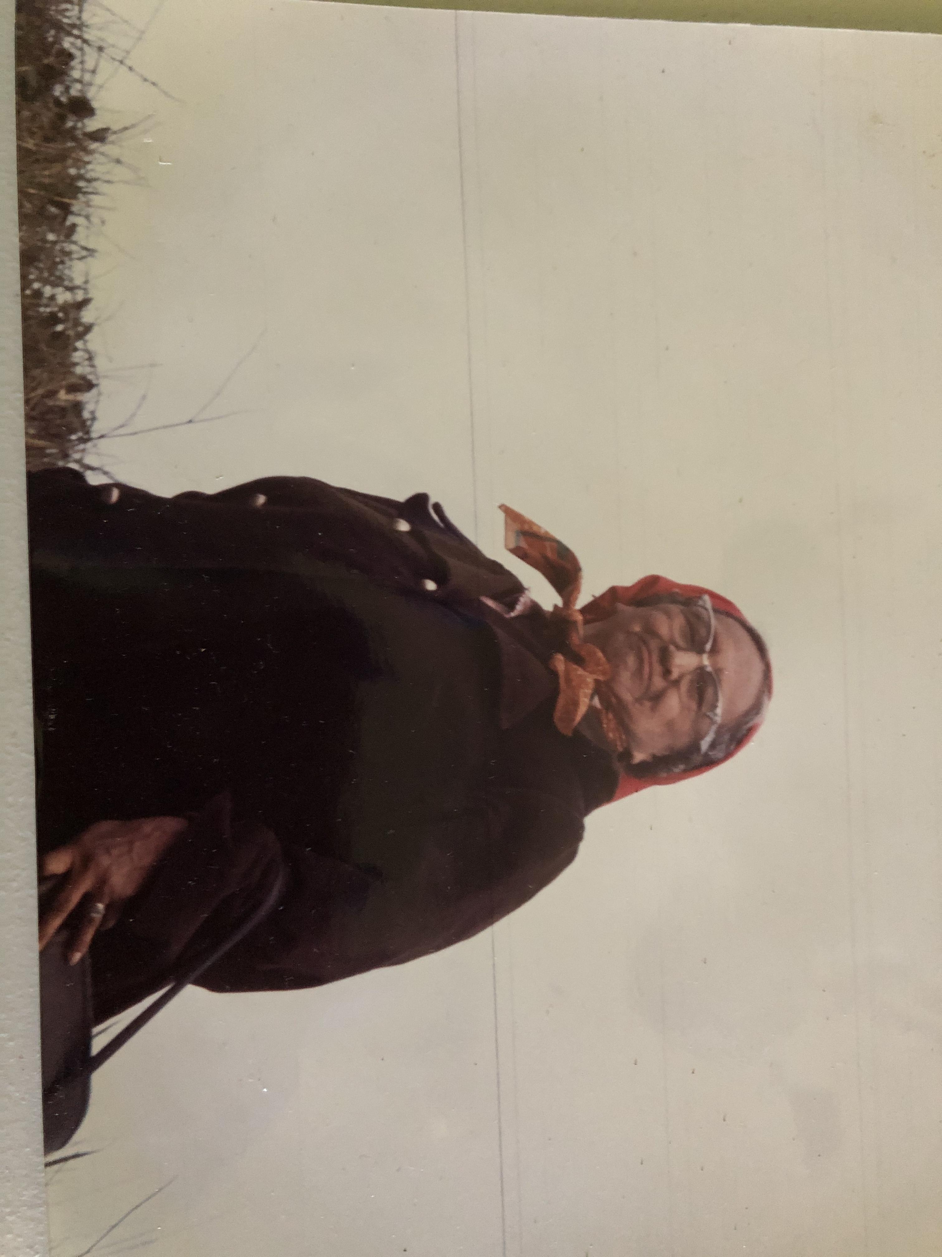 Black and white pencil drawing of an elderly woman wearing glasses and a headscarf.
