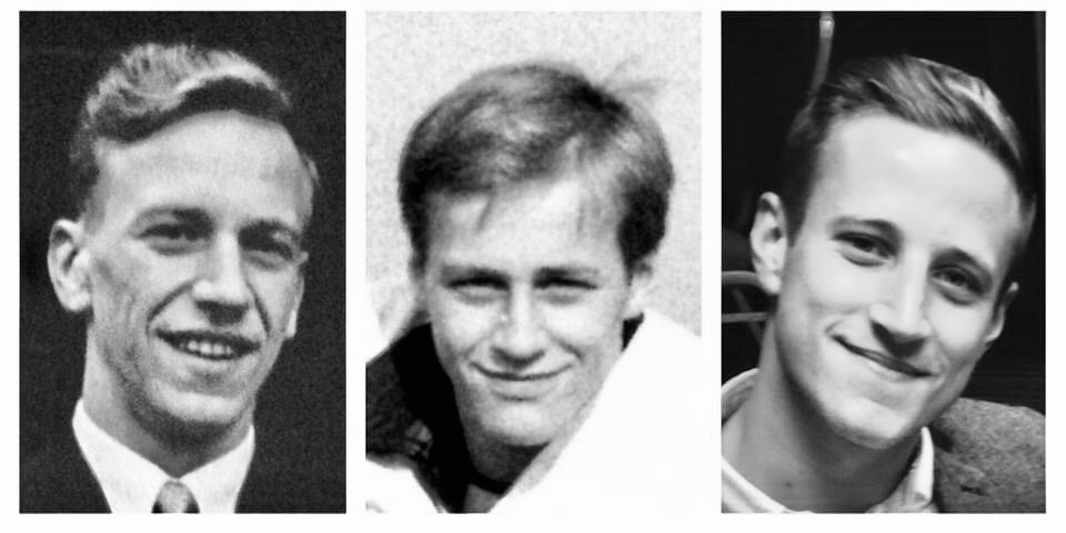Black and white portrait drawing of three generations of men: an older man with glasses and a beard, a younger man, and a boy.