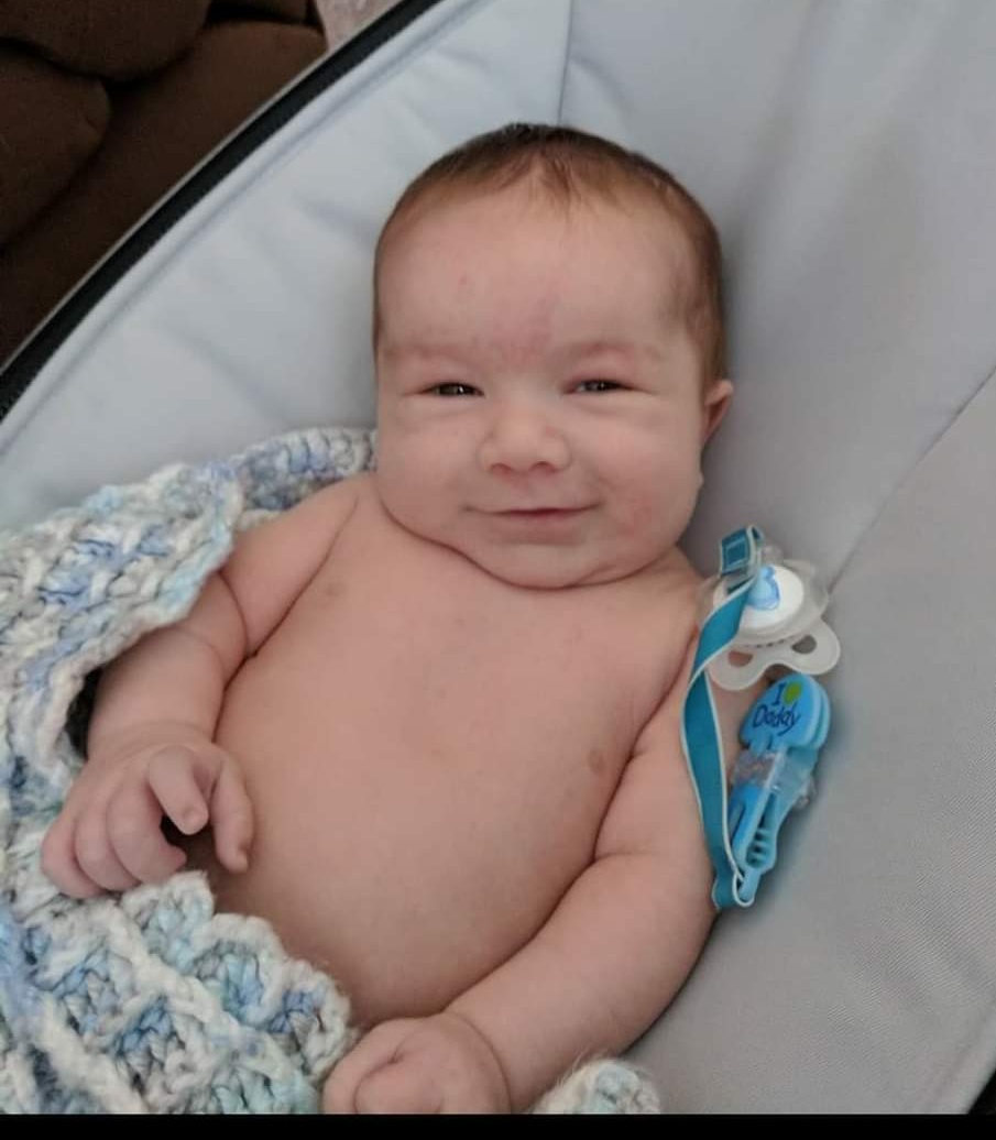 Pencil sketch of a smiling baby wrapped in a blanket, holding a pacifier.