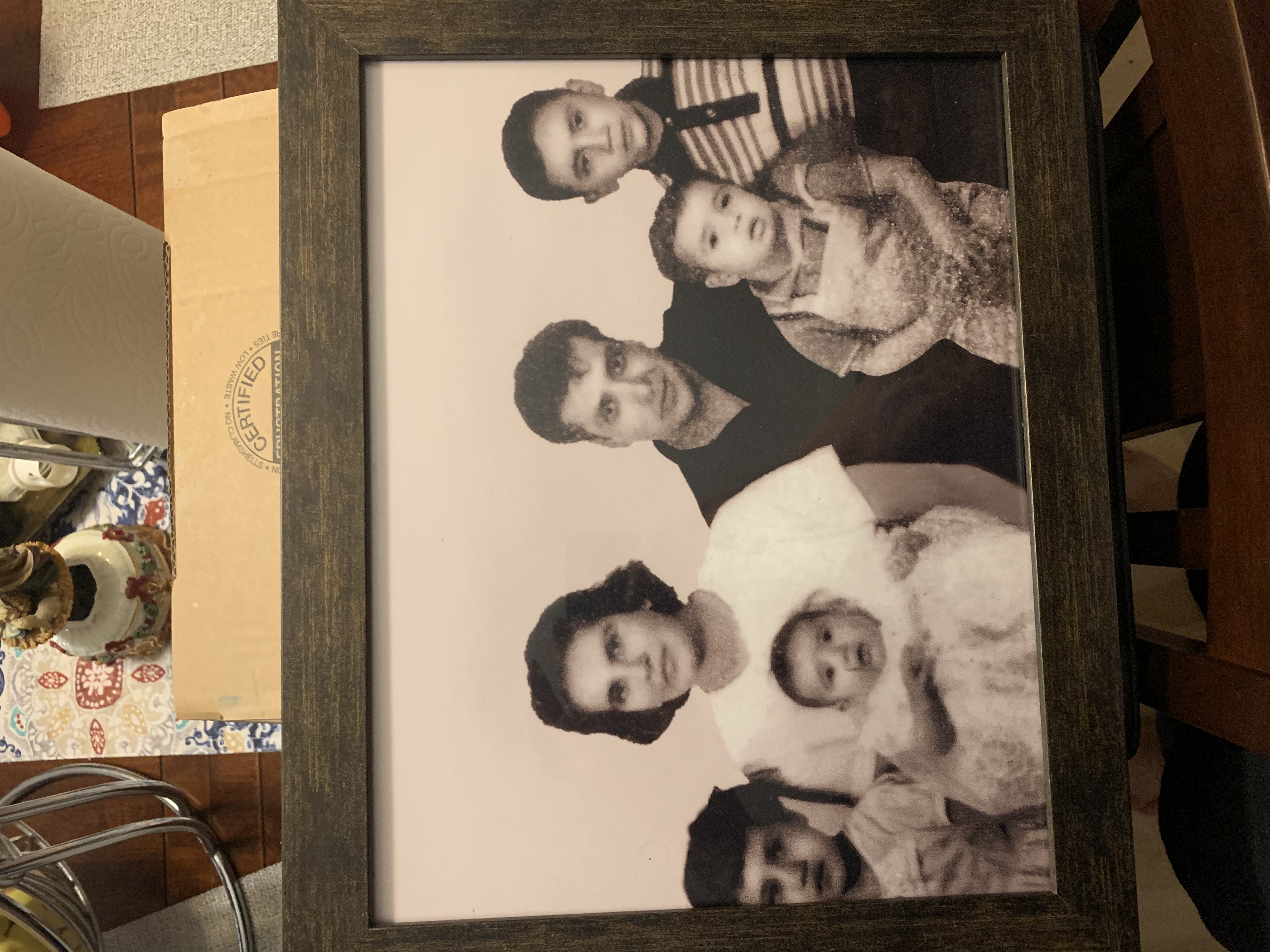 Black and white pencil sketch of a family portrait: seven siblings posing together.