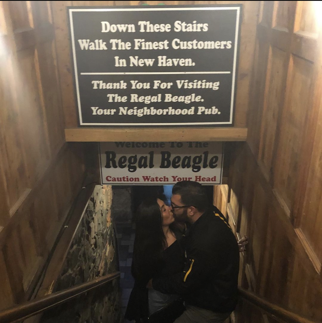 Black and white pencil drawing of a couple kissing in front of The Regal Beagle pub sign.