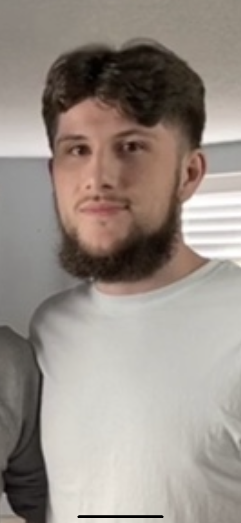 Black and white pencil portrait of a young man with short hair, goatee, and wings behind him.
