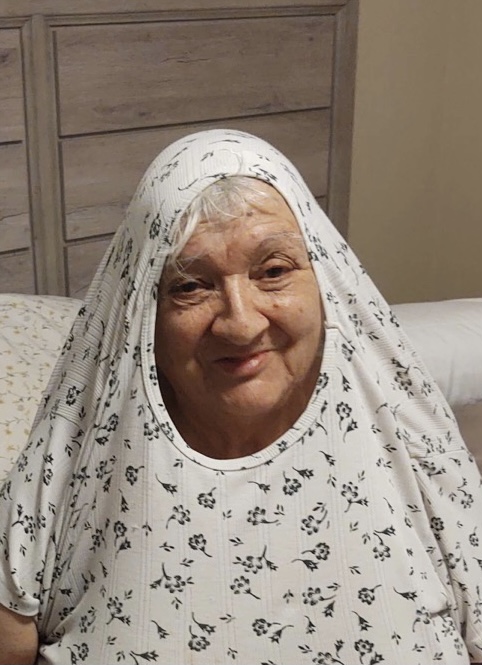 Black and white pencil sketch of an elderly woman wearing glasses holding a baby.