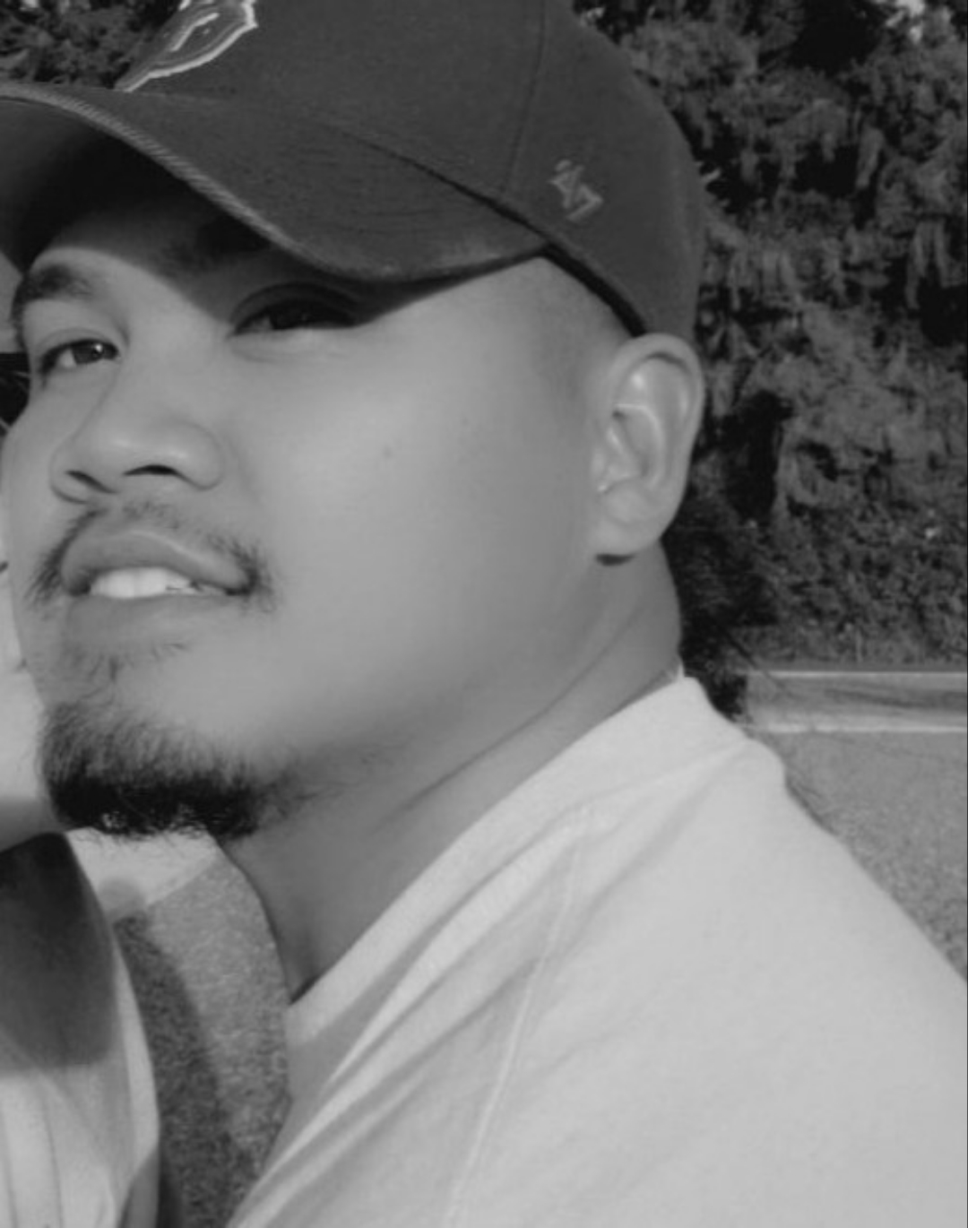 Pencil sketch of a father and daughter, the father is wearing a baseball cap.