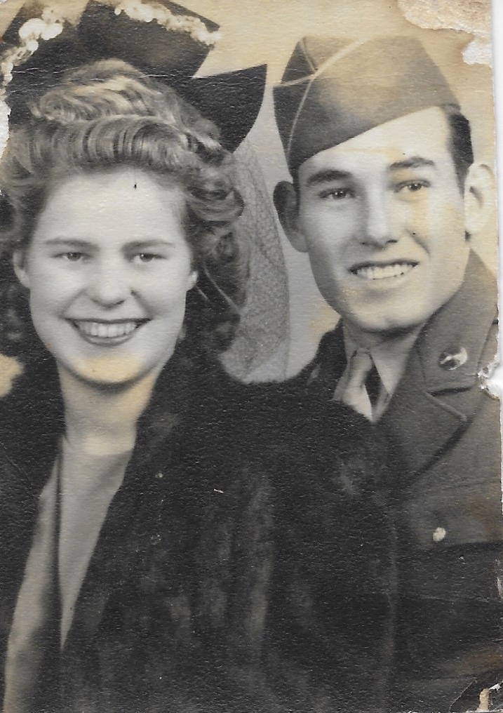Black and white pencil sketch of a bride and groom, the groom is in military uniform.