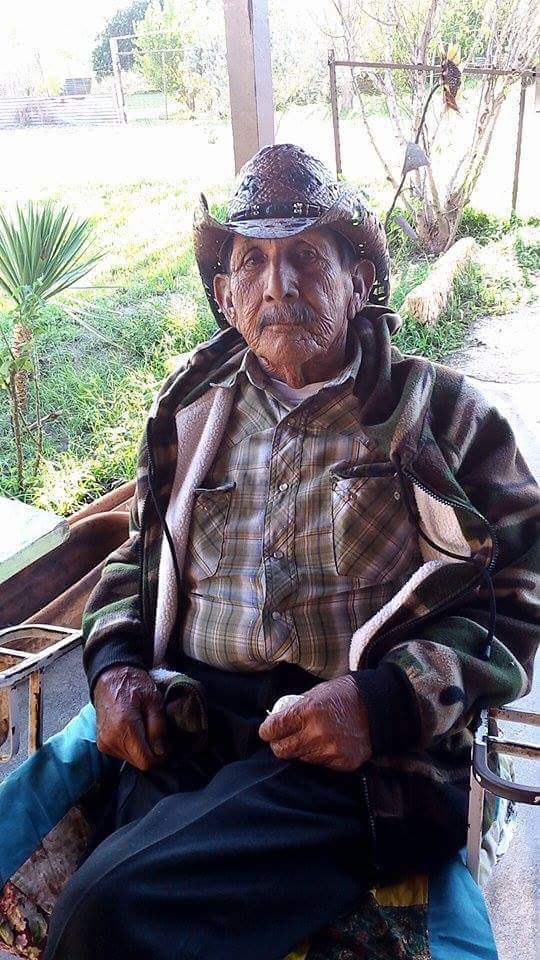 Black and white pencil sketch of an elderly man in a cowboy hat.