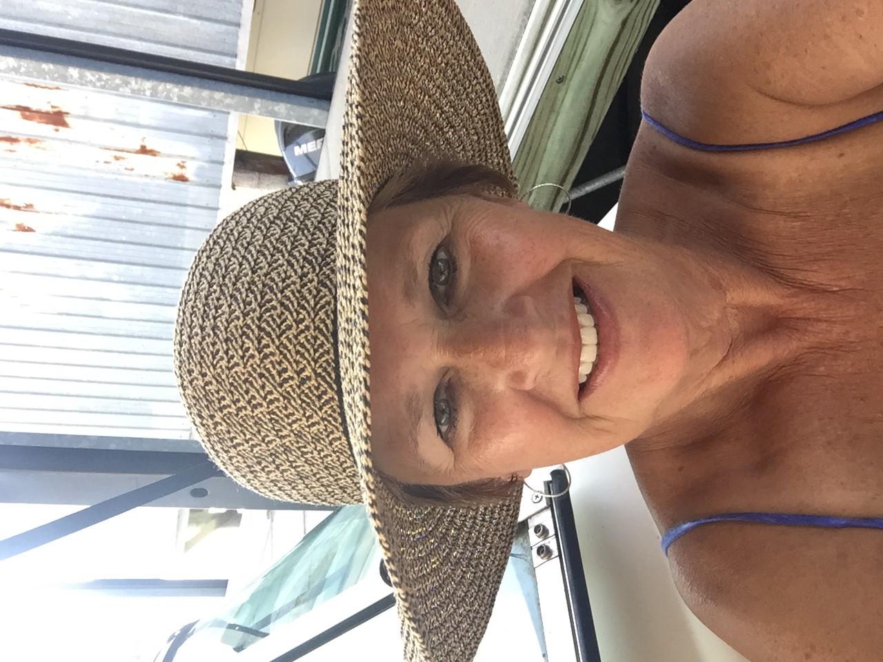 Black and white pencil sketch of a smiling woman wearing a wide-brimmed hat.