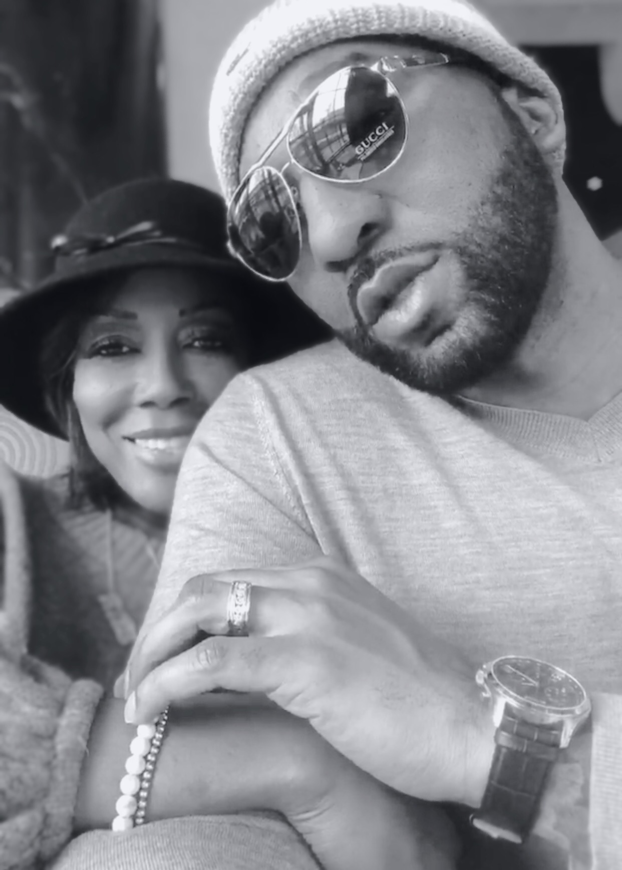Black and white pencil sketch of a couple, the man wears sunglasses and a knit cap, the woman wears a hat.