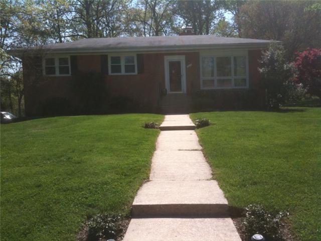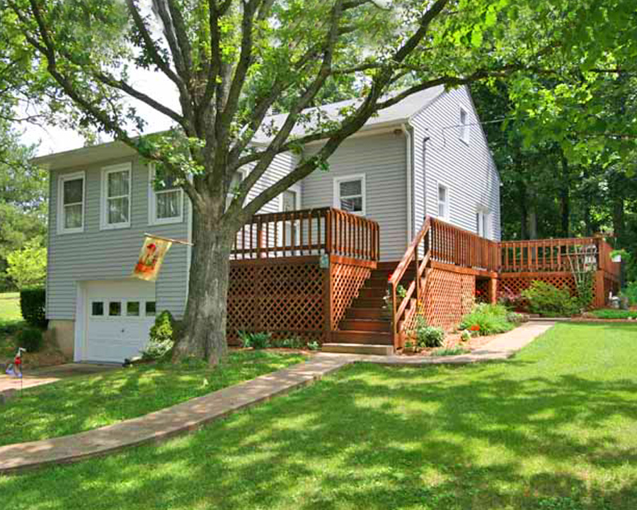 Watercolor painting of a red brick ranch house with a walkway and green lawn.