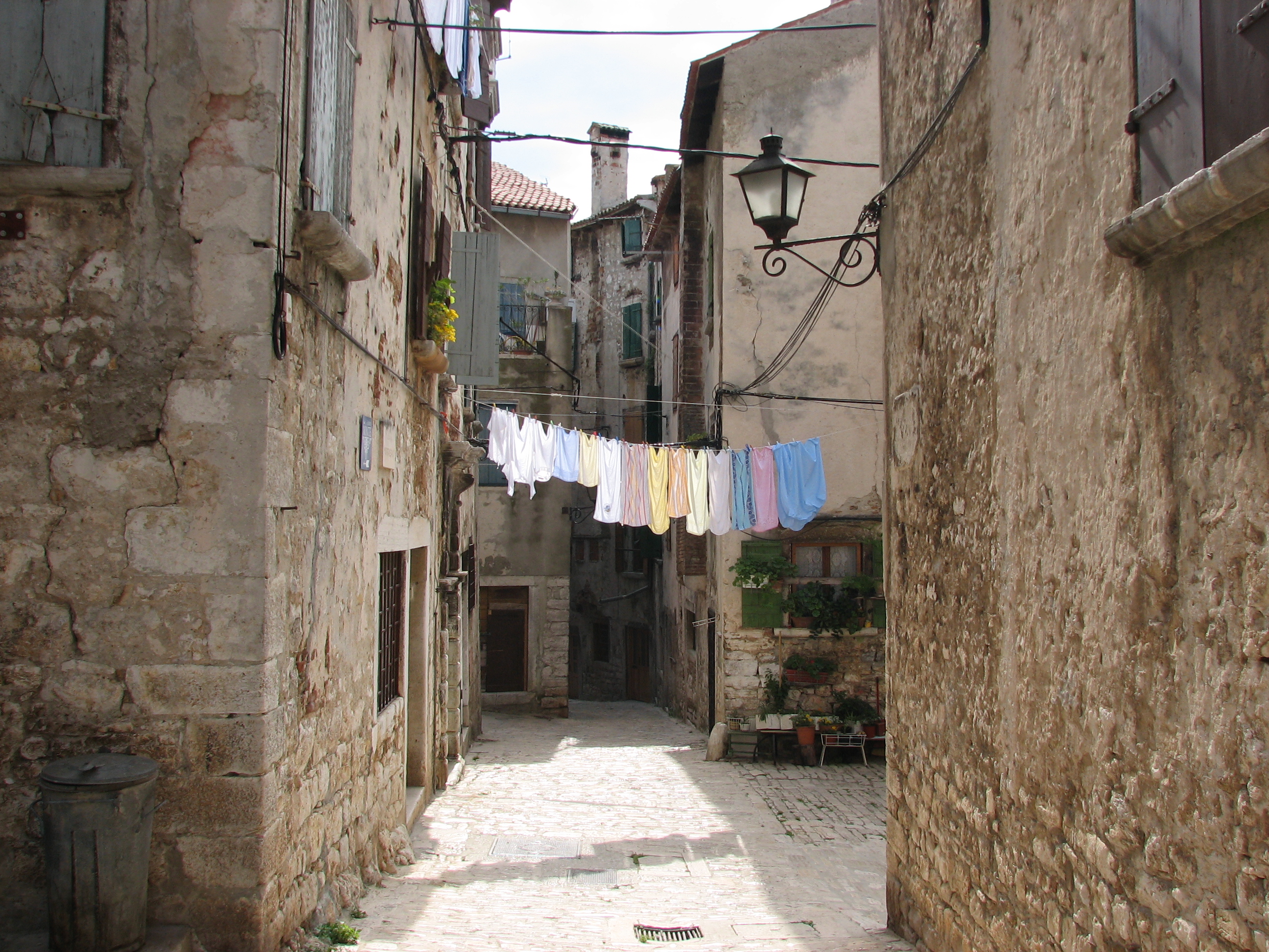 Painting of laundry hanging in a narrow alleyway between aged stone buildings.