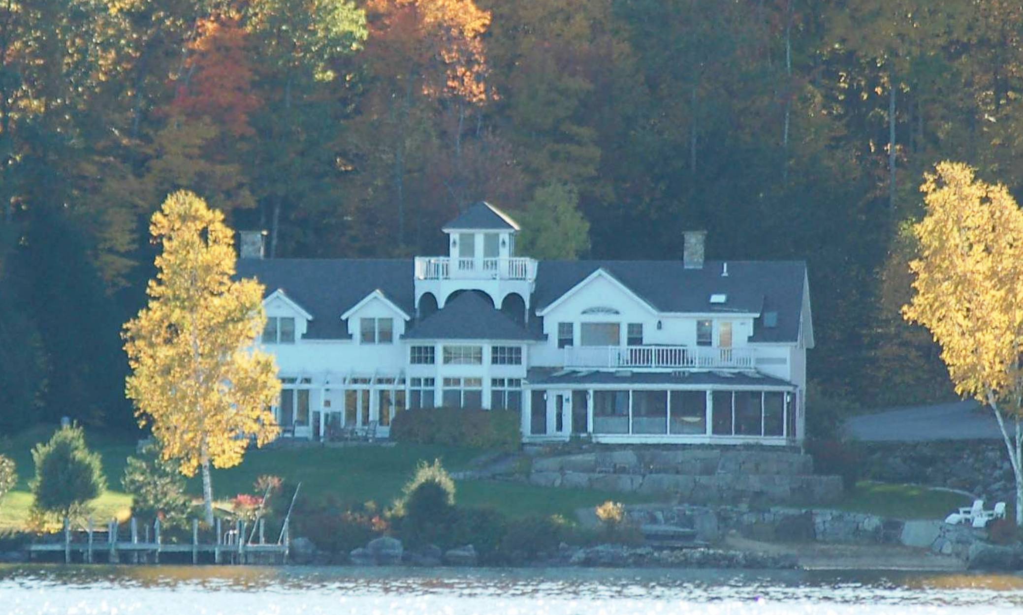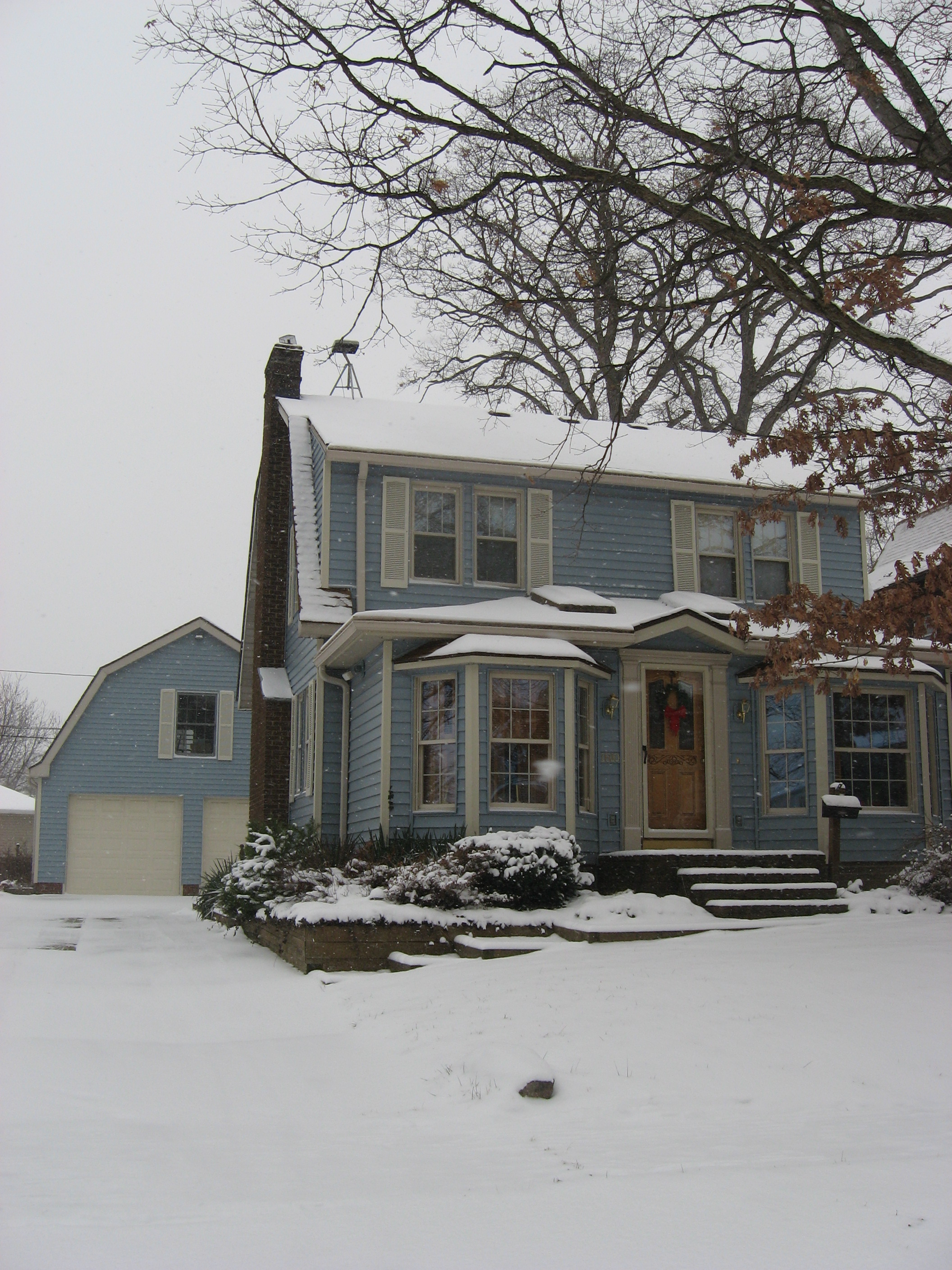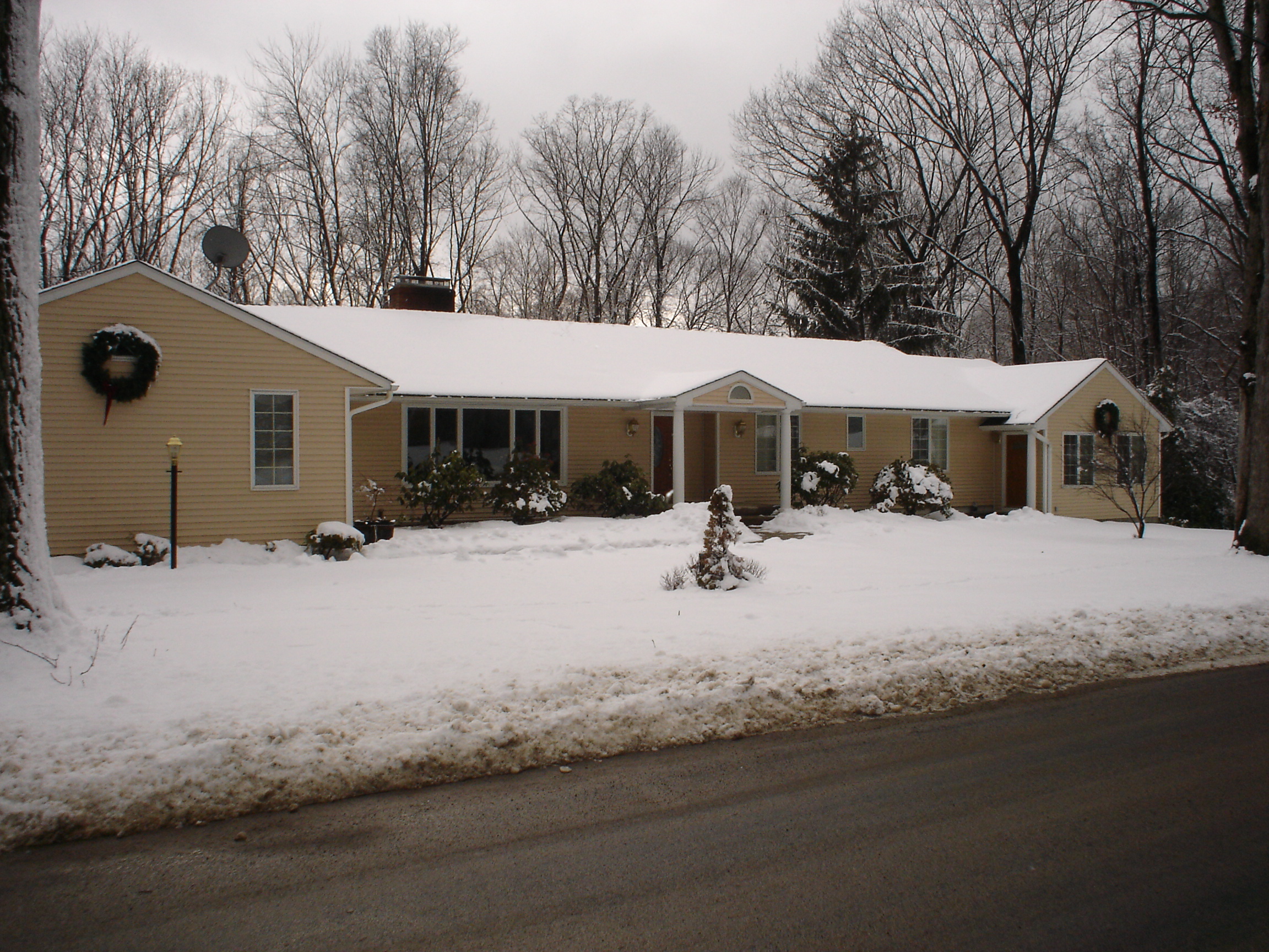 Snow-covered yellow house with Christmas wreath and lamppost, surrounded by snow-covered trees and shrubs.