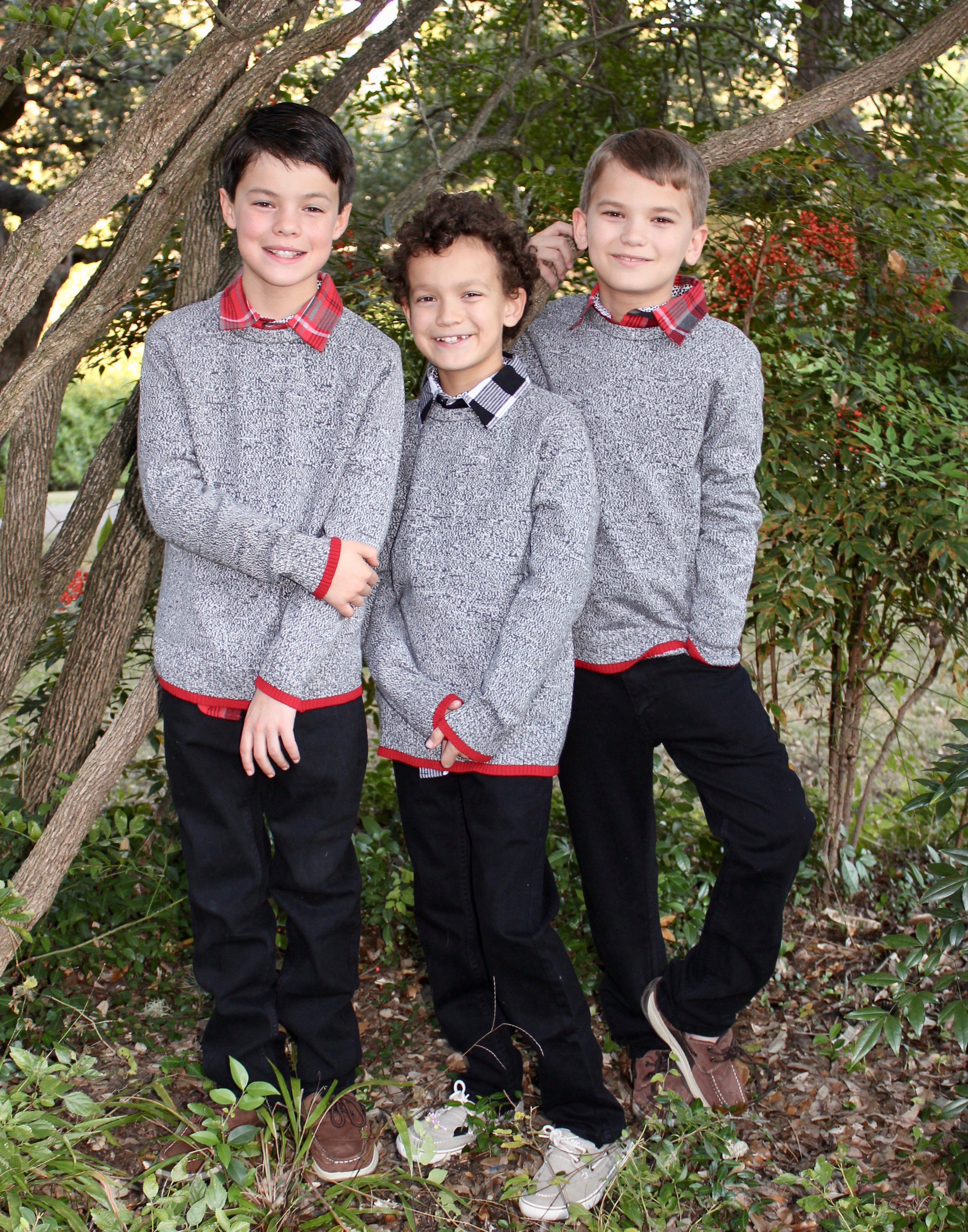 Painting of three boys in gray sweaters and dark pants standing together outdoors under a tree.