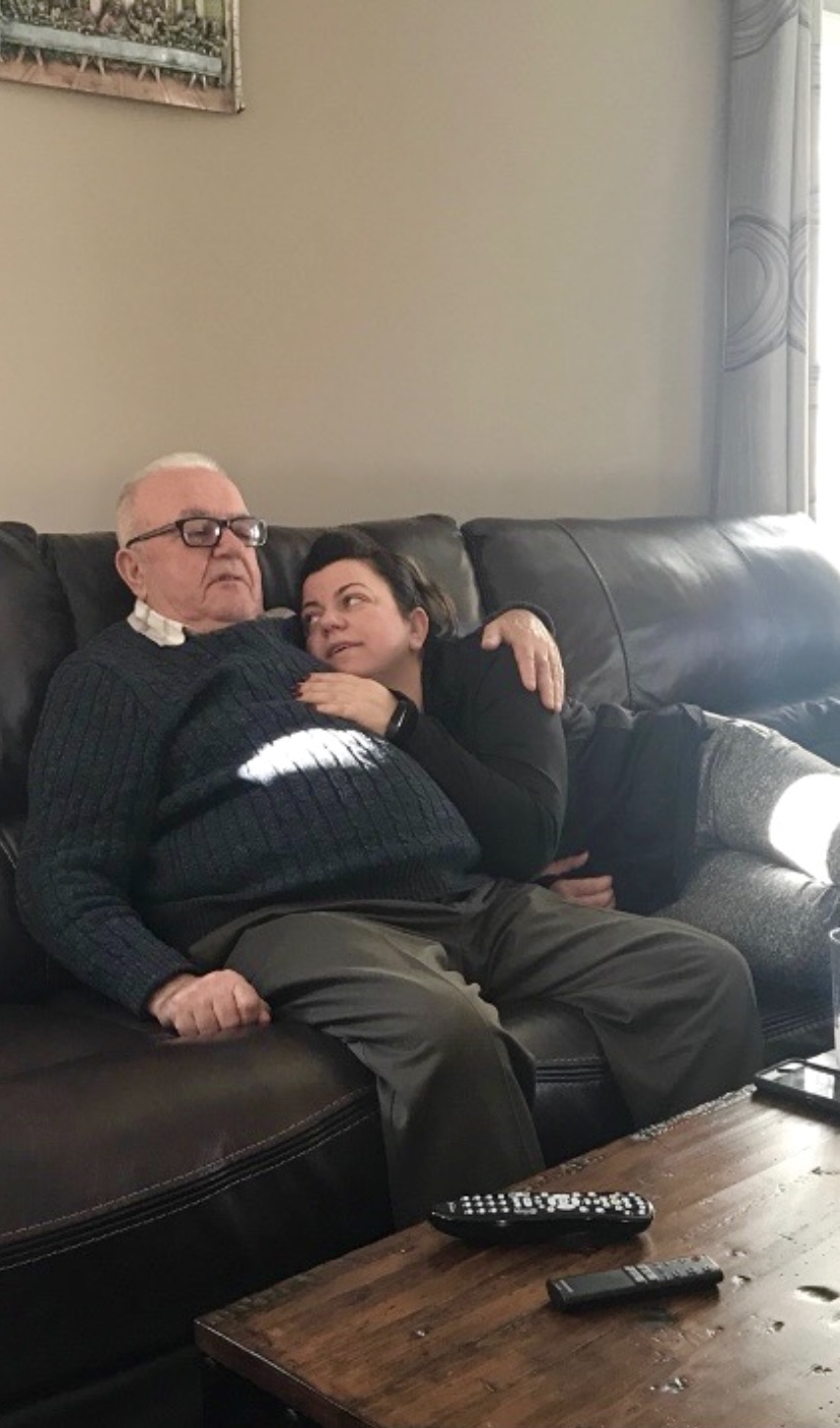 Painting of an older man and a younger woman sitting close together on a couch.