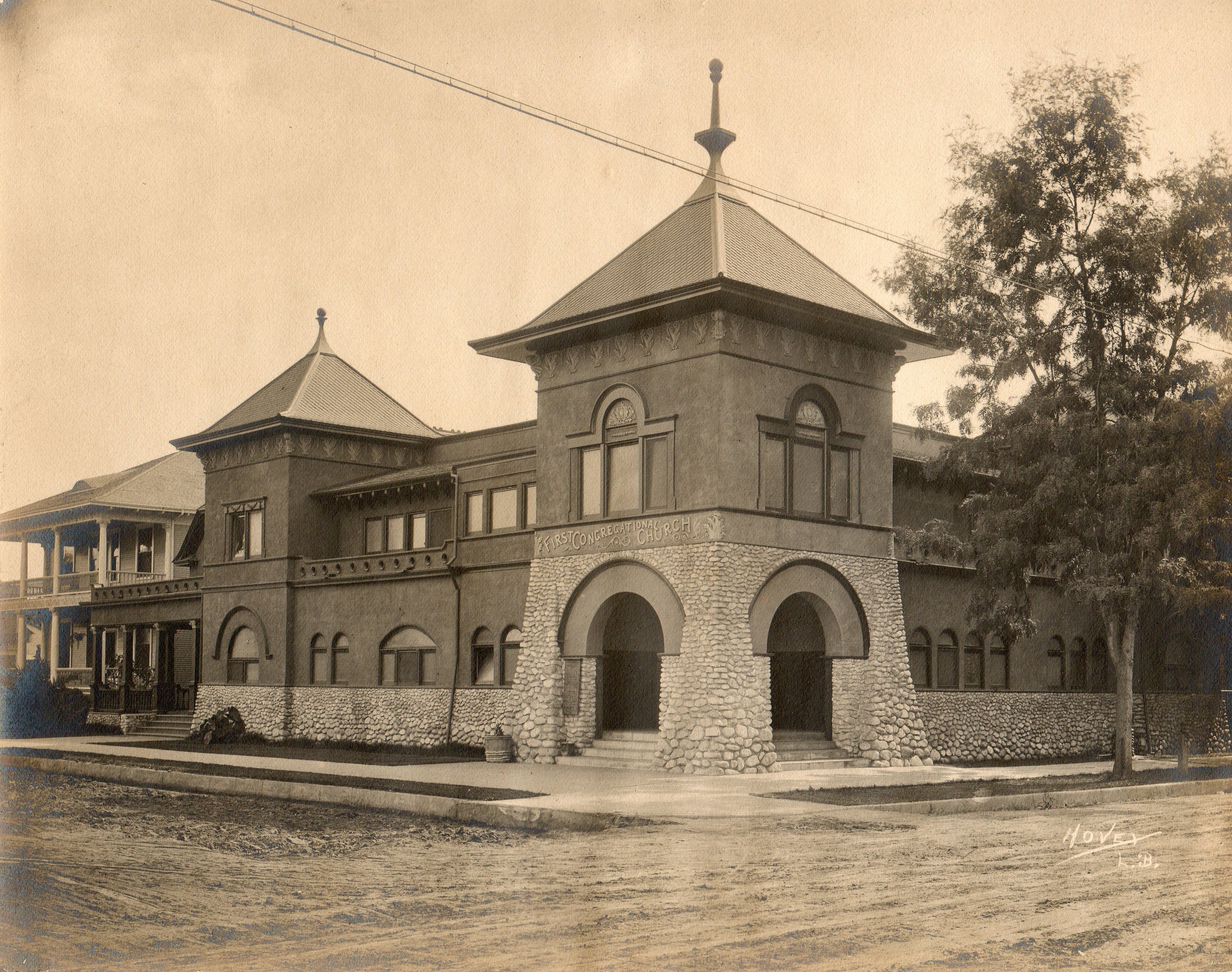 Painting of First Congregational Church with people standing outside.