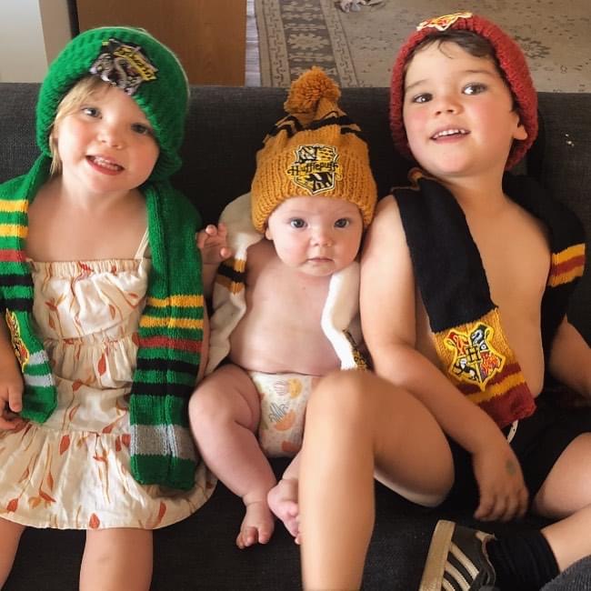 Painted portrait of three young children wearing Harry Potter house scarves and hats.