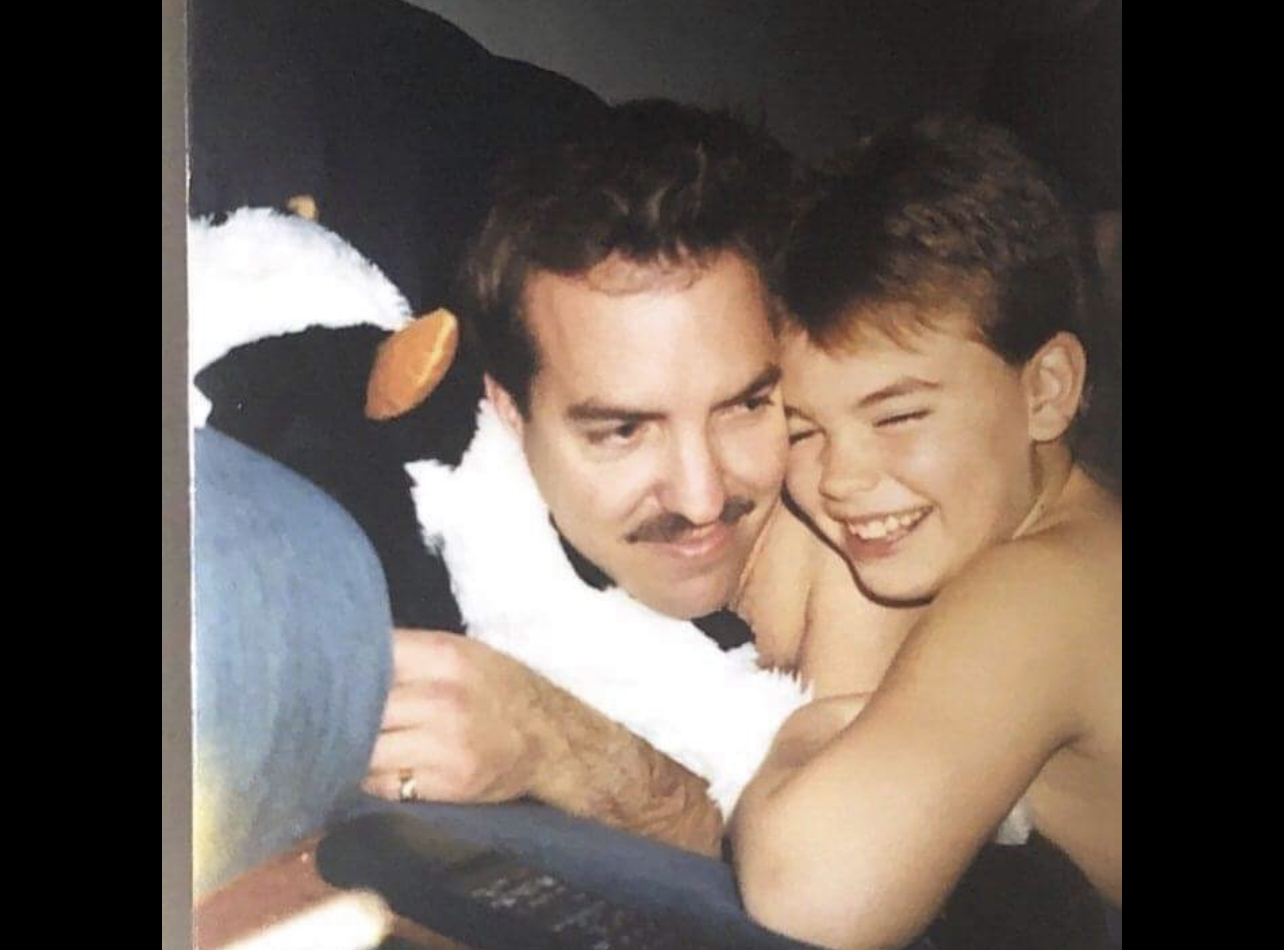 Painting of a father and son embracing, both with angel wings.