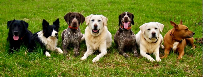 Painting of six dogs lying in grass.
