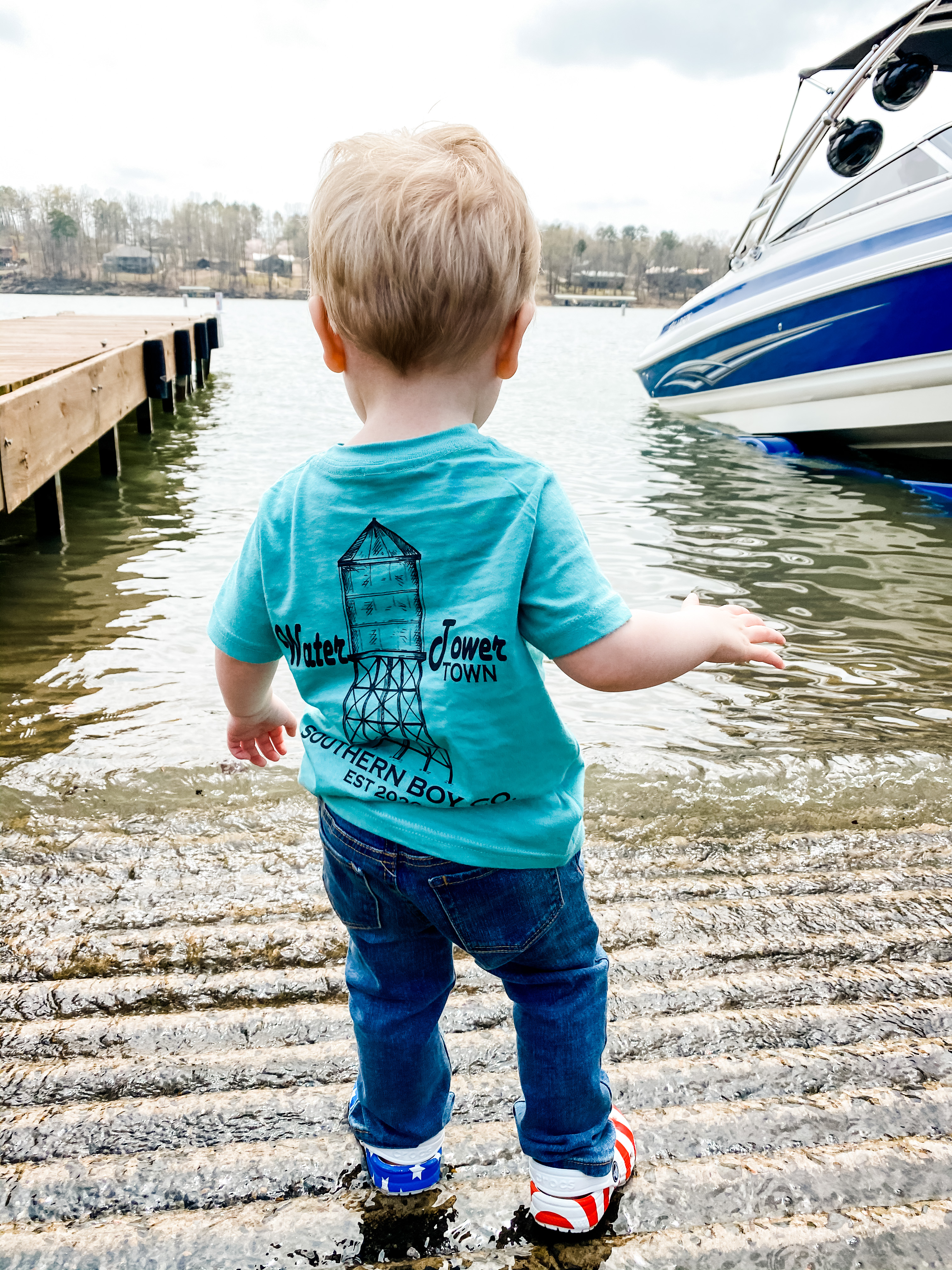 Toddler in blue shirt facing away from viewer, toward water and boat.