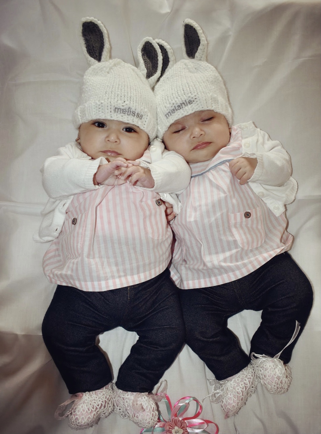 Painting of twin babies wearing bunny ear hats, one is awake, the other asleep.