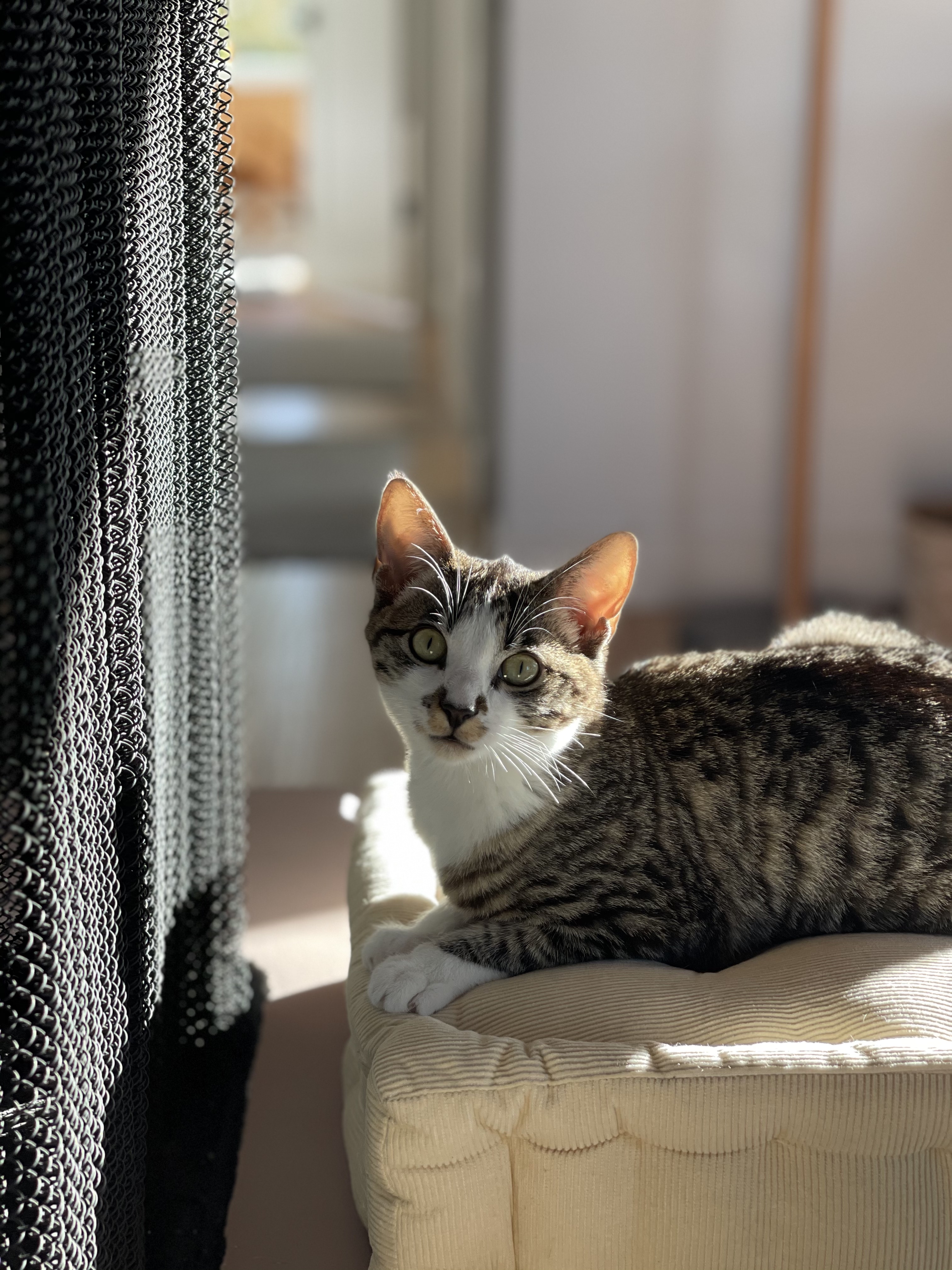 Painting of three cats sitting on pillows in front of a fireplace
