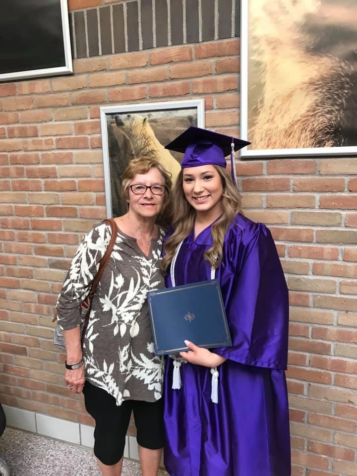 Painting of a mother and daughter, the daughter is wearing a purple graduation cap and gown.