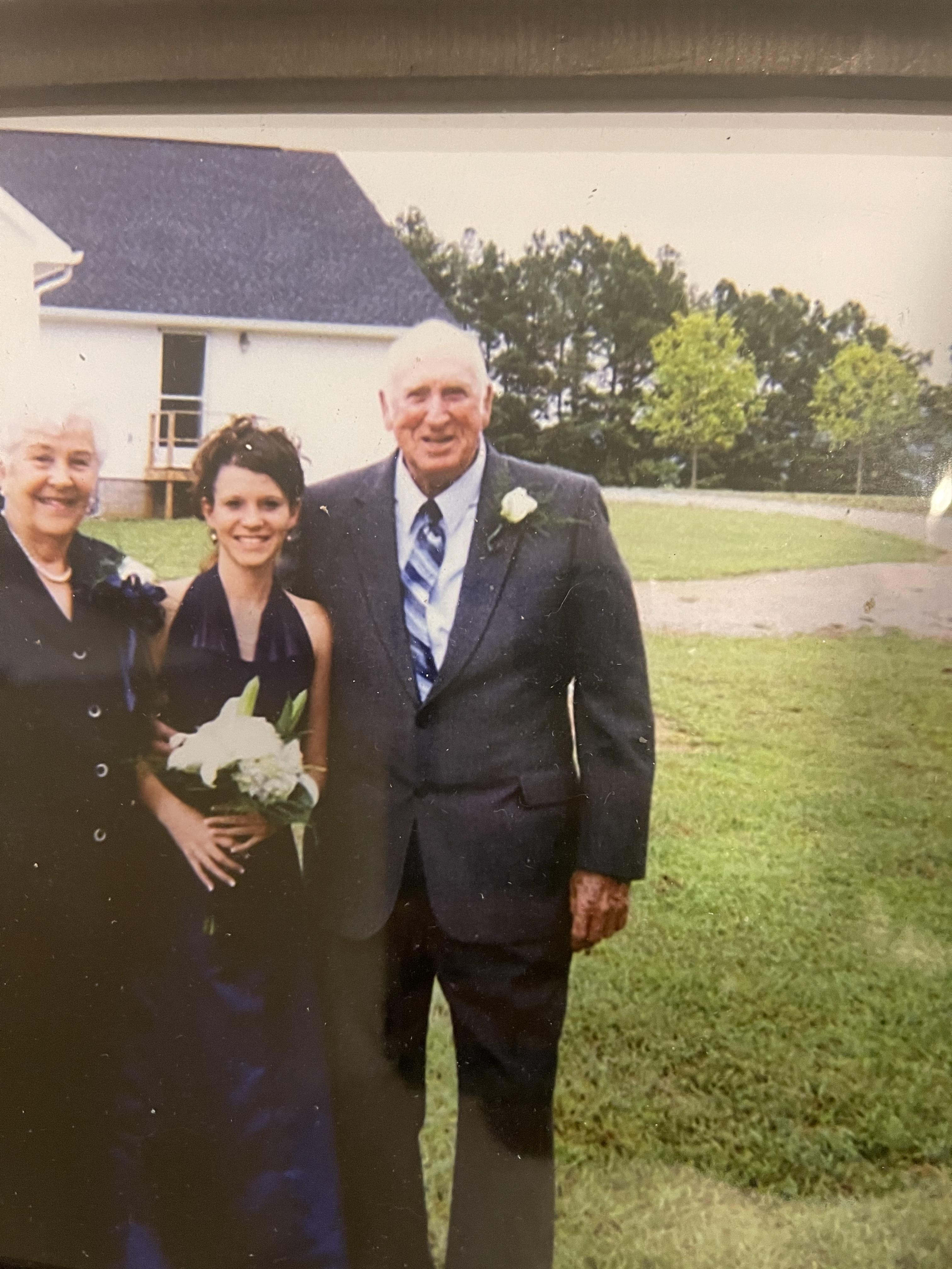 Painted portrait of a family: a young man in a suit and cowboy hat, an older man in a suit, an older woman in a light cardigan, and a young woman in a wedding dress holding a bouquet.