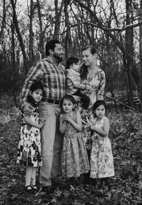 Painted portrait of a family: two adult men, two adult women, and a young child.