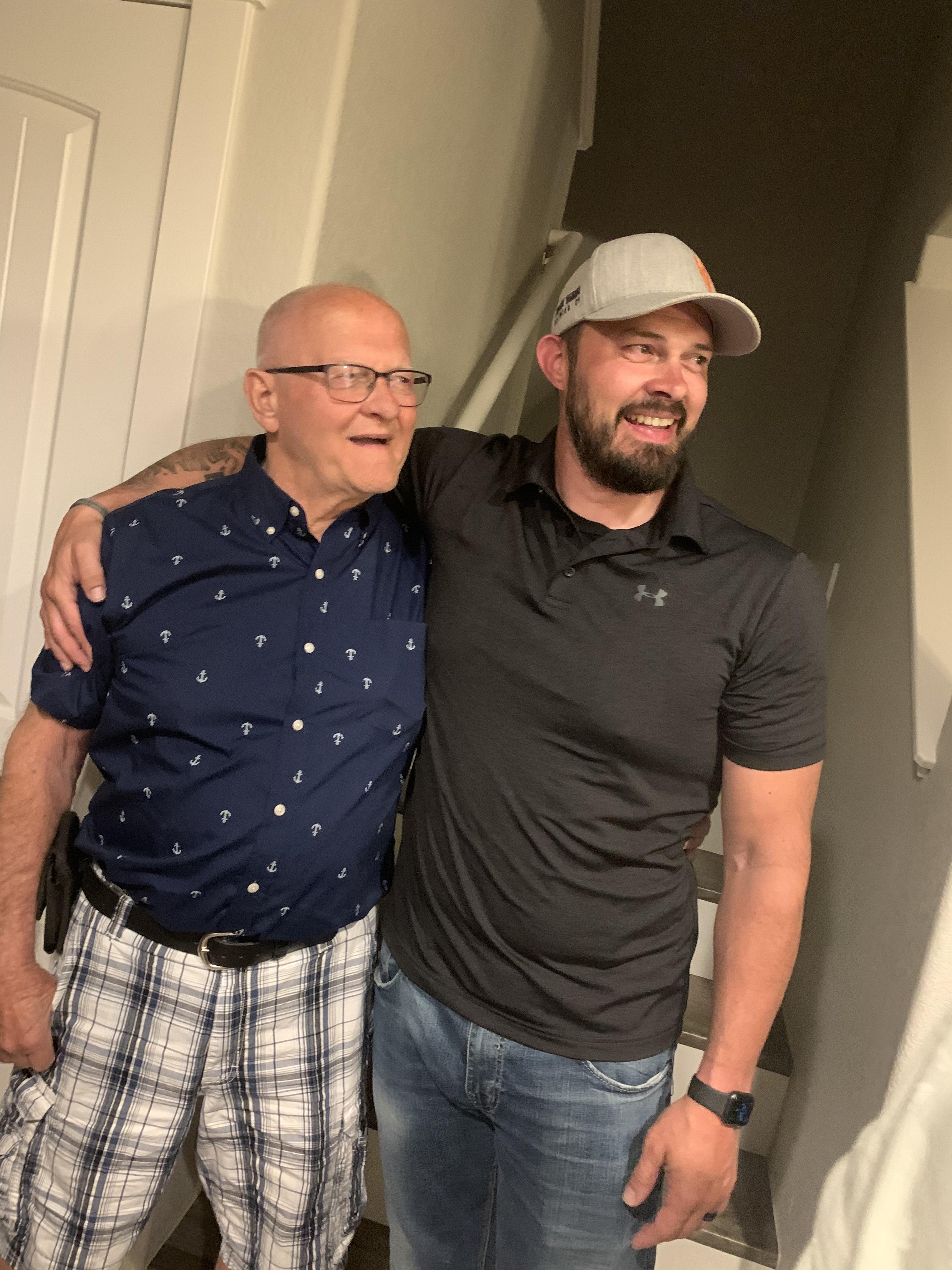 Painting of an older man with glasses and a younger man with a baseball cap, arm around each other, smiling.