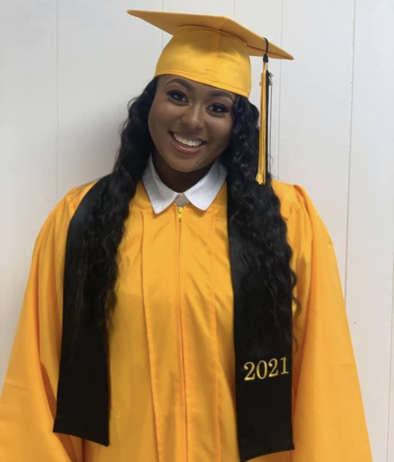 Painting of a graduate in a yellow cap and gown with a woman depicted as an angel beside her.