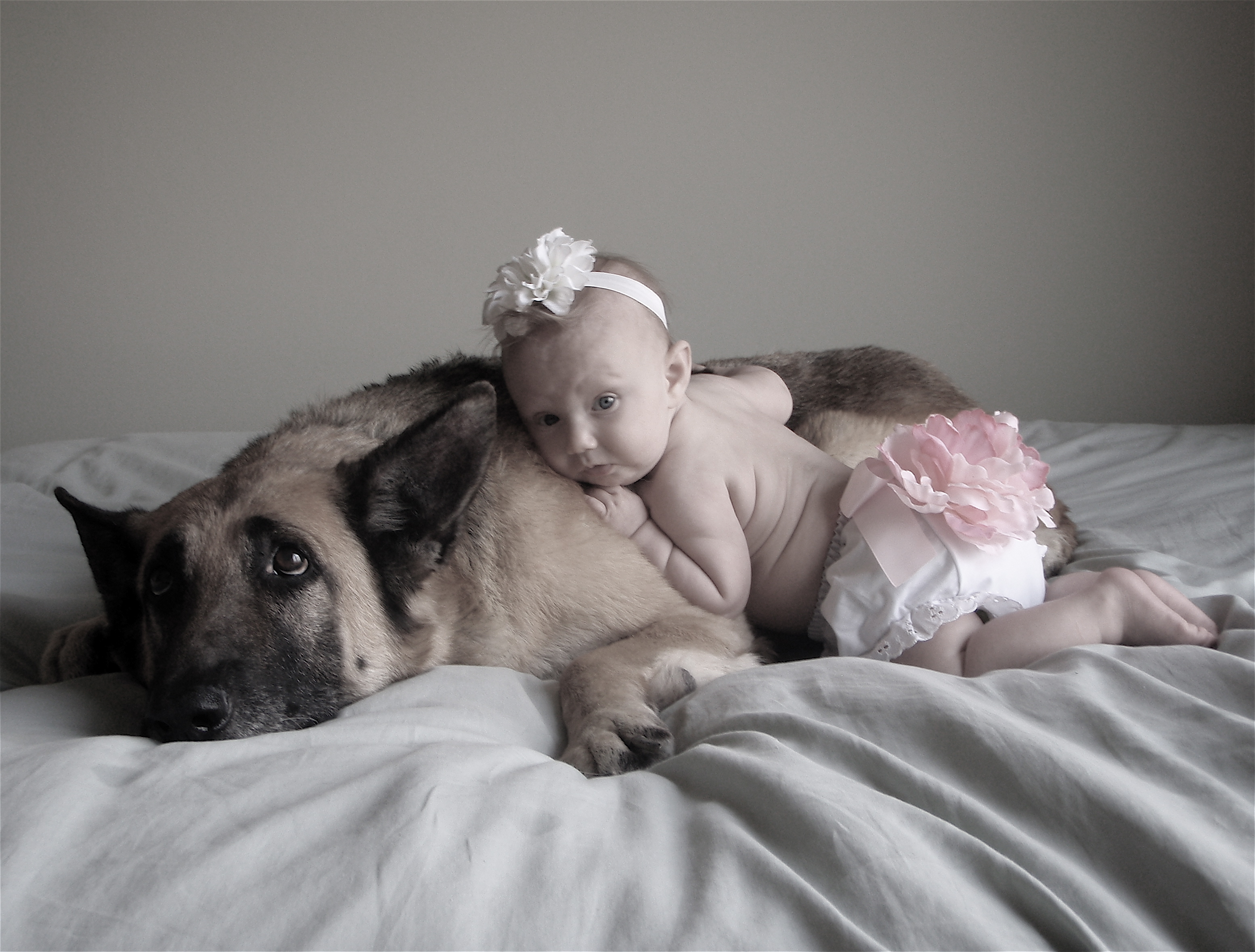Painting of a German Shepherd dog and a baby lying together.